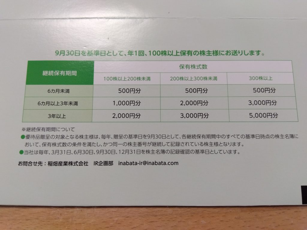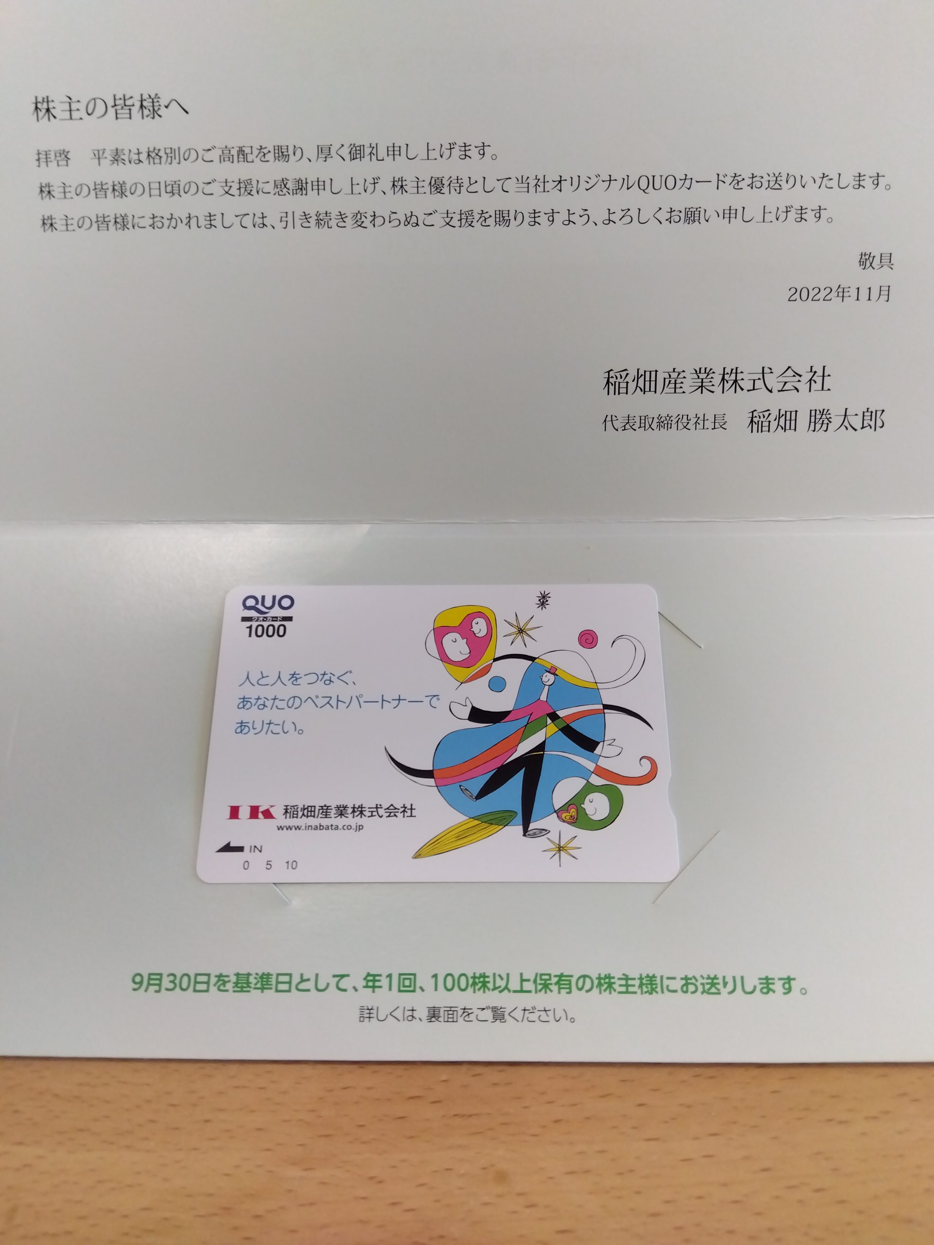 株主優待を頂きましたQUOカード【証券コード8098】【稲畑産業株式会社さん】 株主優待9月確定 X Facebook はてブ LINE コピー 2022.12.10 2022/12/5、QUOカード1,000円分を頂きました!! 100株保有で、保有期間が6ヶ月以上になったので1,000円分になります。 稲畑産業株式会社さんありがとう!! 下の写真が株主優待の詳細です。 過去の配当情報はコチラ!!
