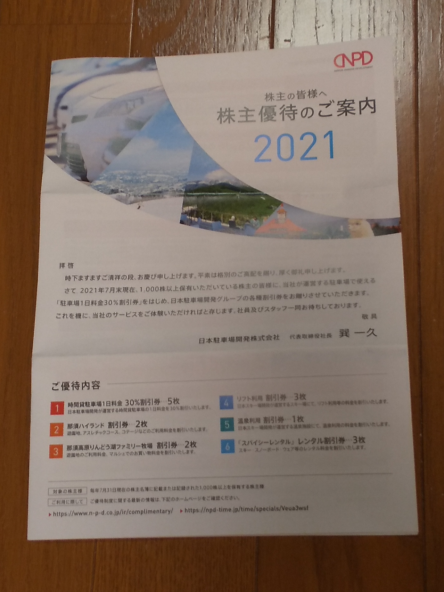 株主優待を頂きました割引券【証券コード2353】【日本駐車場開発株式会社さん】 株主優待7月確定 X Facebook はてブ LINE コピー 2021.10.31 2021/10/28、株主優待(割引券)を頂きました!! 日本駐車場開発株式会社さんありがとう!! ただ、福岡だと使える施設がかなり限られてしまうので、ちょっと使い勝手が悪いですね。