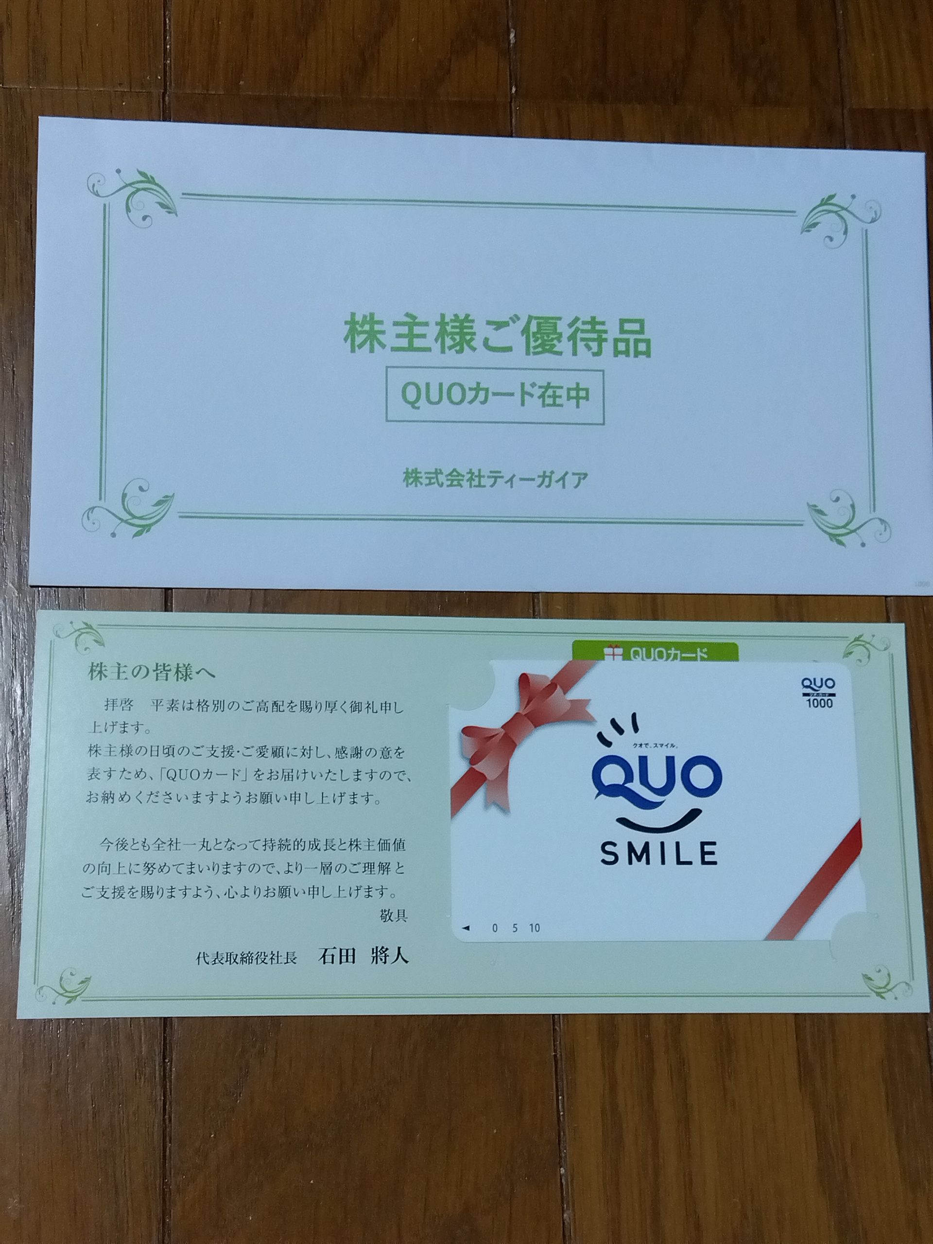 株主優待を頂きましたQUOカード【証券コード3738】【株式会社ティーガイアさん】 株主優待3月確定 X Facebook はてブ LINE コピー 2023.06.28 2023/6/26、株主優待のQUOカード1,000円分を頂きました!! 株式会社ティーガイアさんありがとう!! 今回、QUOカードのデザインが普通のものですね。コスト削減?でしょうか。 過去の配当情報はコチラ!!