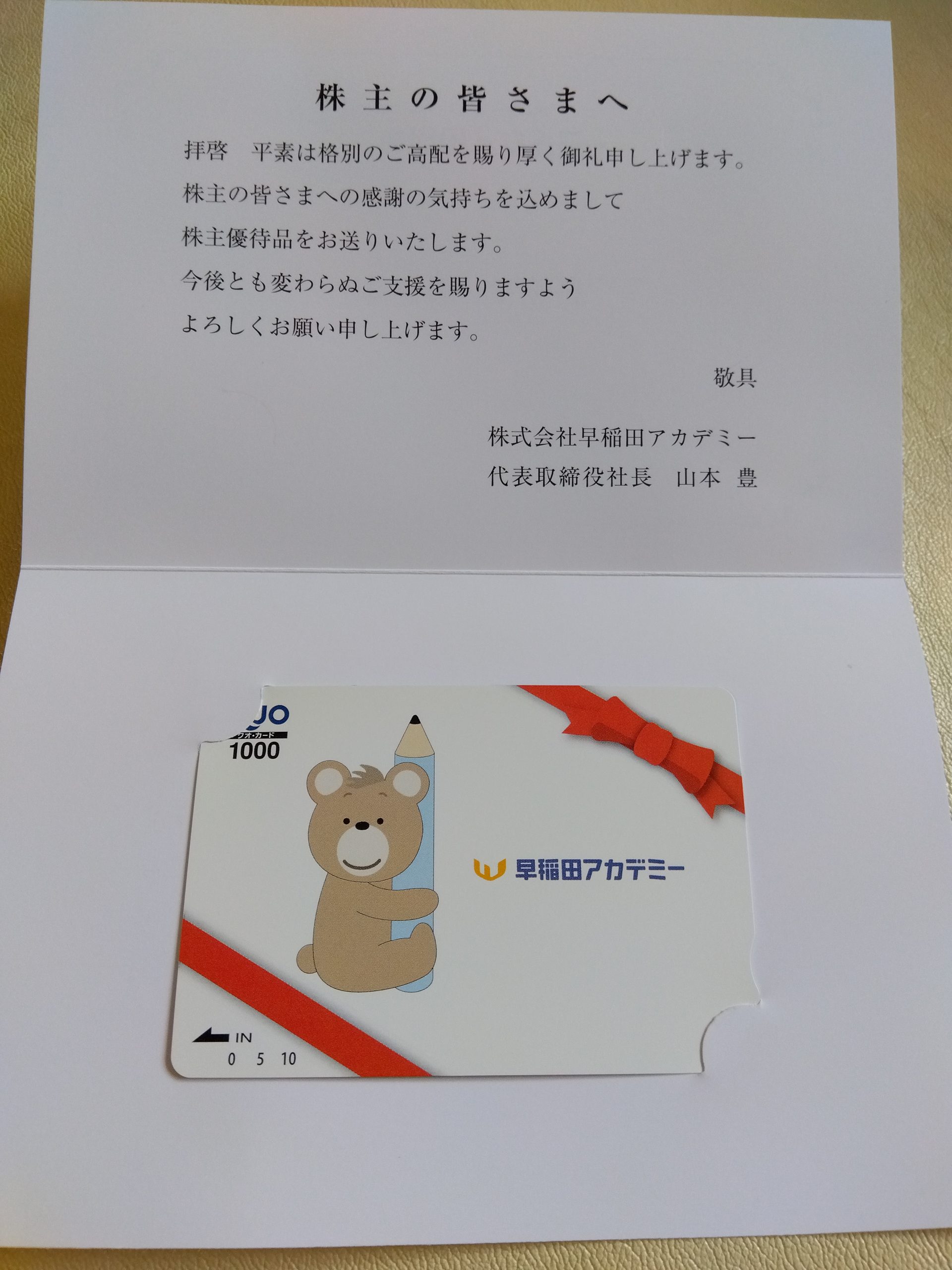 株主優待を頂きましたQUOカード【証券コード4718】【株式会社早稲田アカデミーさん】 株主優待3月確定 X Facebook はてブ LINE コピー 2023.07.02 2023/6/30、QUOカード1,000円分を頂きました!! 100株保有で保有期間が3年未満なので1,000円分になります。 暫くは保有ですね~。 株式会社早稲田アカデミーさんありがとう!! 過去の配当情報はコチラ!!