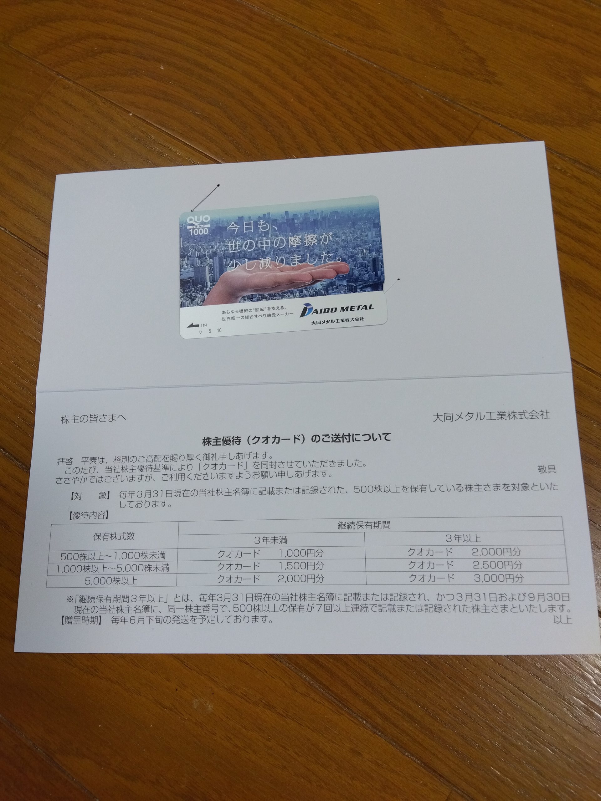 株主優待3月確定2023/7/3、QUOカード1,000円分を頂きました!!
