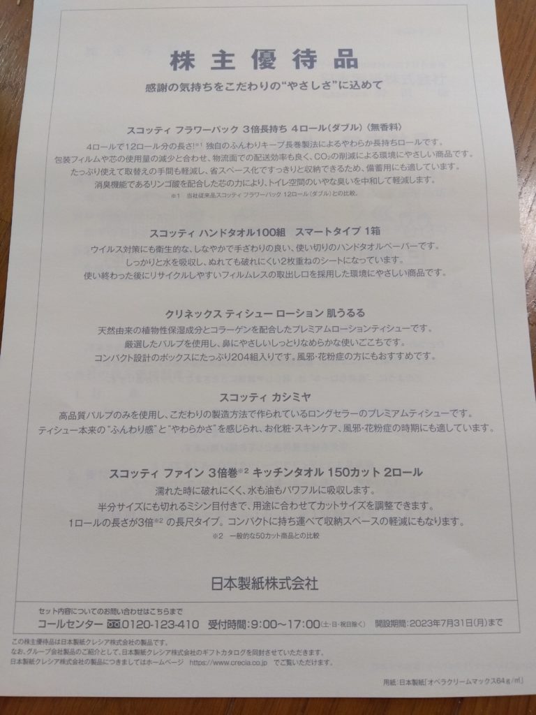 株主優待を頂きました家庭用品詰合せ【証券コード3863】【日本製紙株式会社さん】 株主優待3月確定 X Facebook はてブ LINE コピー 2023.07.09 2023/7/3、紙関係の家庭用品詰合せ、3,000円相当分を頂きました!! 100株以上の保有で、一律3,000円相当分が頂けます。 日本製紙株式会社さんありがとう!! ただ2023年3月期は、中間・期末とも無配が痛いですね。 過去の配当情報はコチラ!!