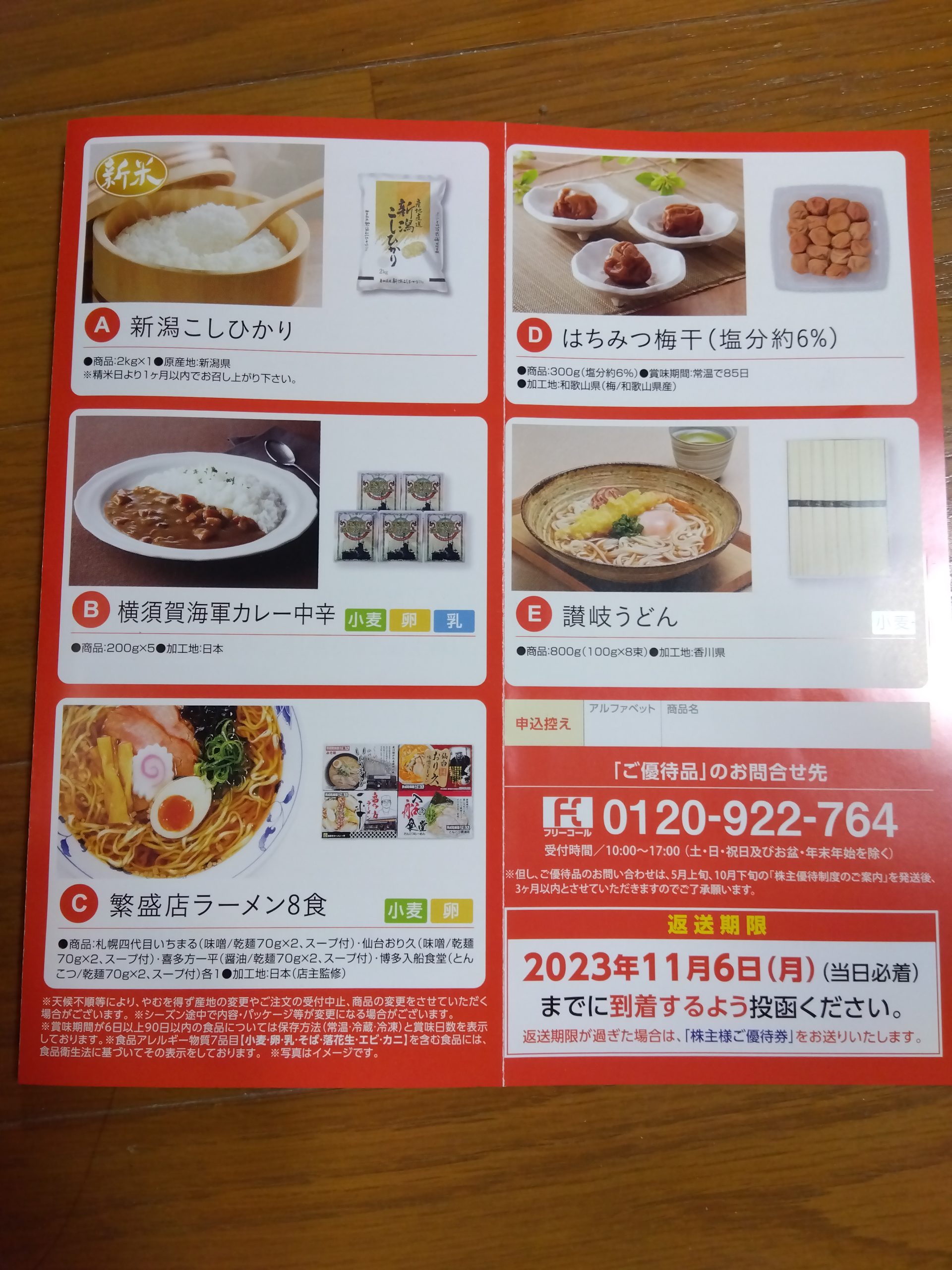 株主優待8月確定2023/10/16、株主優待のご案内を頂きました!!