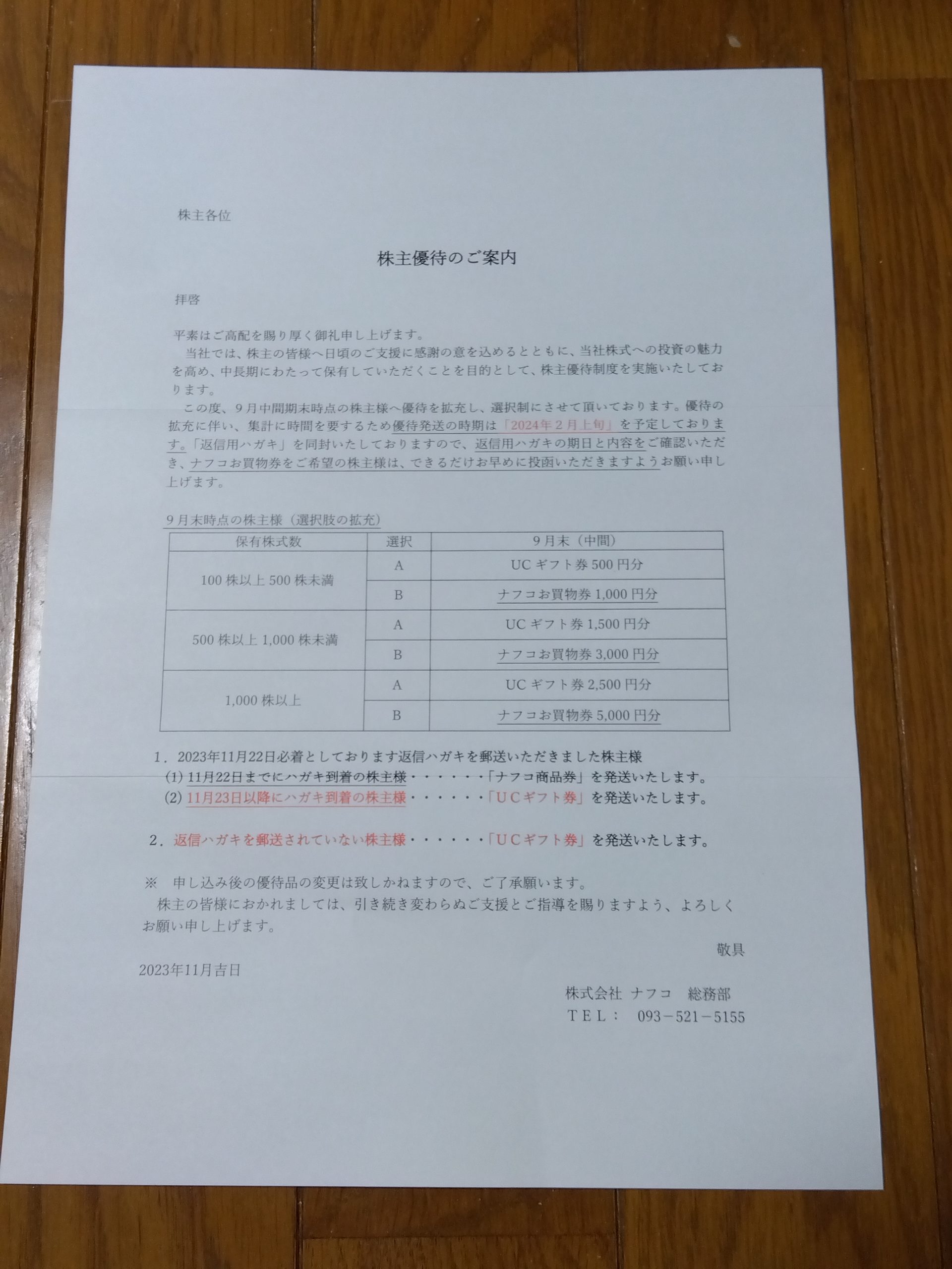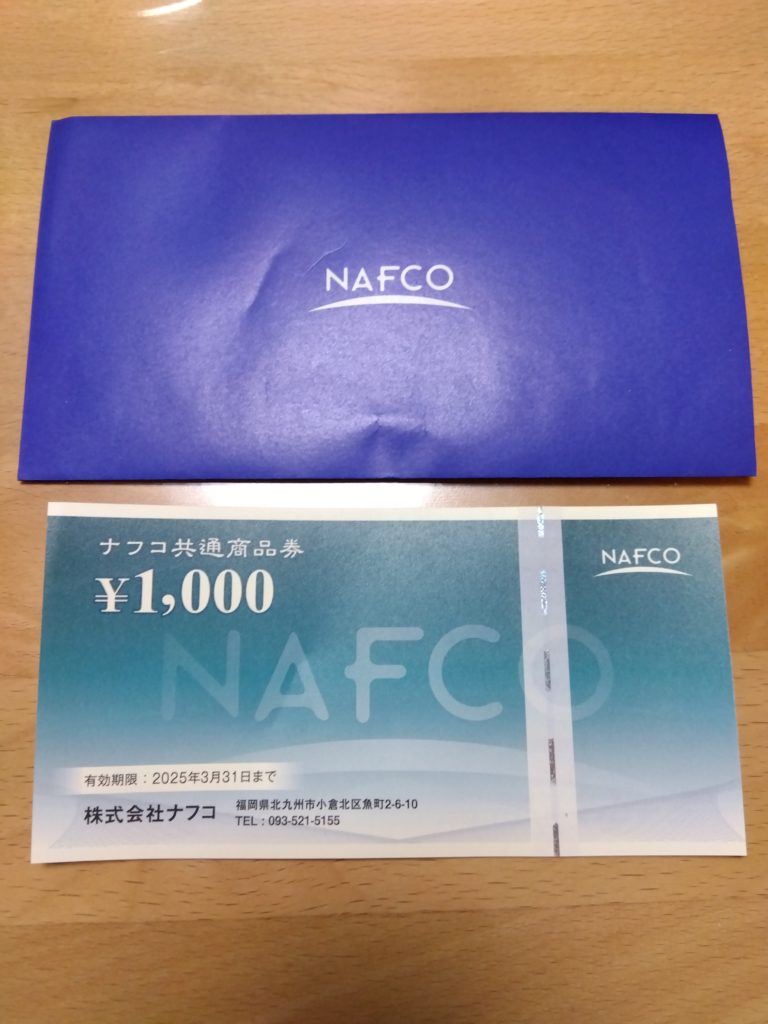 100株保有なので、UCギフト件なら500円分、ナフコお買物券なら1,000円分になります。