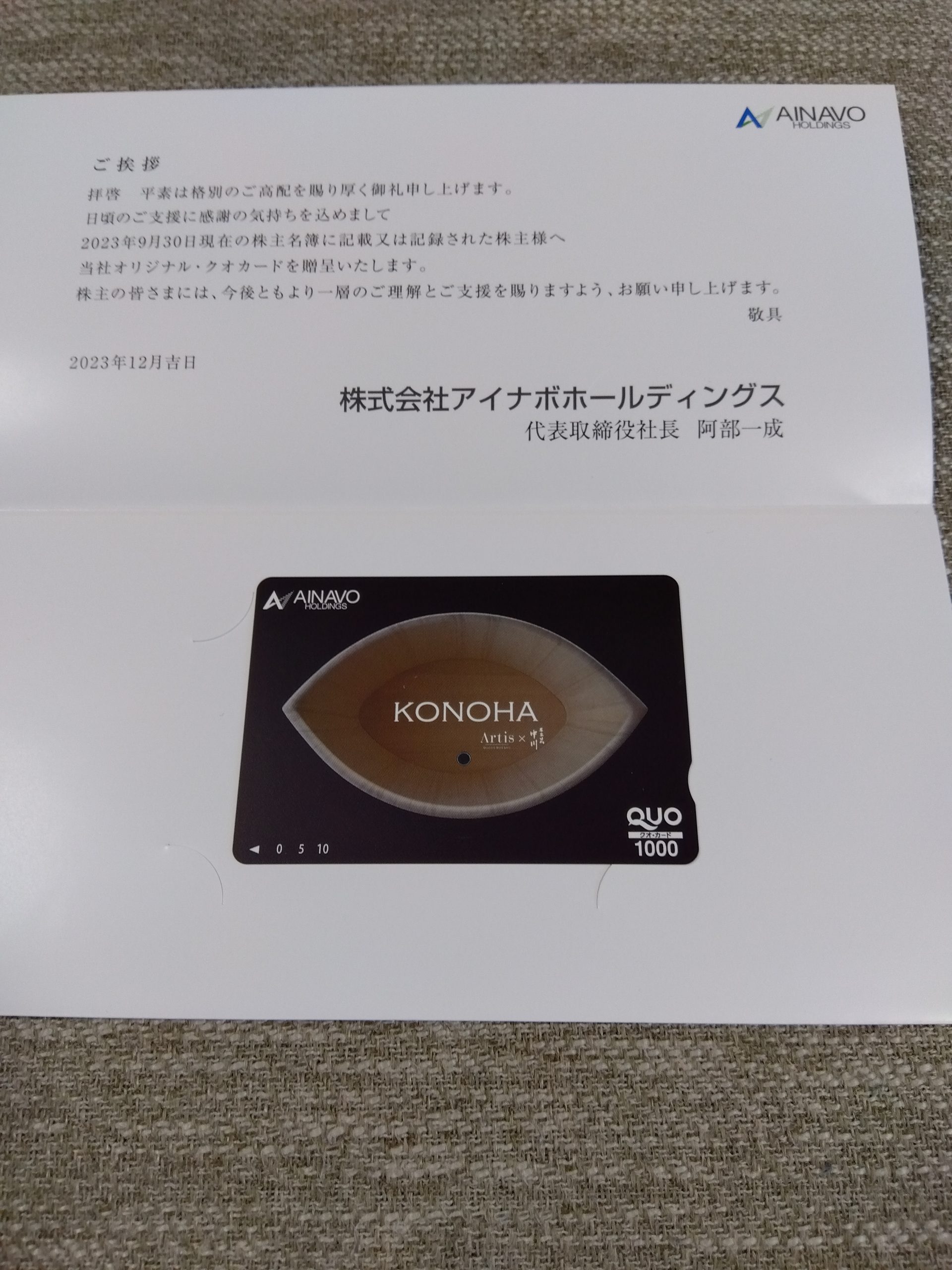 株主優待を頂きましたQUOカード【証券コード7539】【株式会社アイナボホールディングスさん】 株主優待9月確定 X Facebook はてブ LINE コピー 2023.12.03 2023/12/1、株主優待のQUOカード1,000円分を頂きました!! 100株保有で、保有期間にかかわらず1,000円分(年1回)になります。 株式会社アイナボホールディングスさんありがとう!! 過去の配当情報はコチラ!!