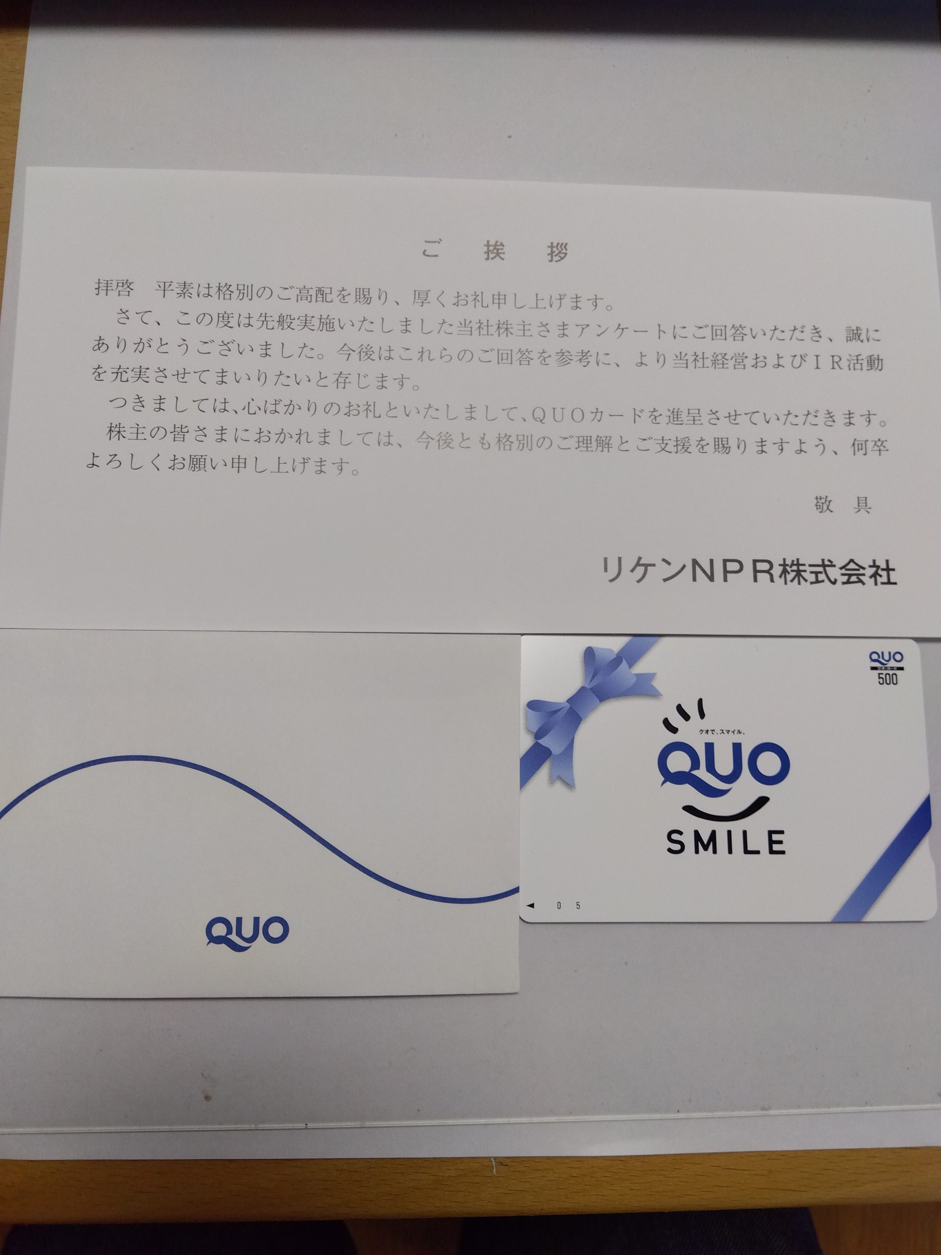 隠れ株主優待を頂きましたQUOカード【証券コード6209】【リケンNPR株式会社さん】 隠れ優待 X Facebook はてブ LINE コピー 2024.02.09 2024/2/9、QUOカード500円分を頂きました!! 株主アンケートの回答に対する隠れ優待です。 アンケートに回答するだけで、500円分いただけるので嬉しいですね。 株価も購入時から倍以上になり、ありがとうございます。 リケンNPR株式会社さんありがとう!!