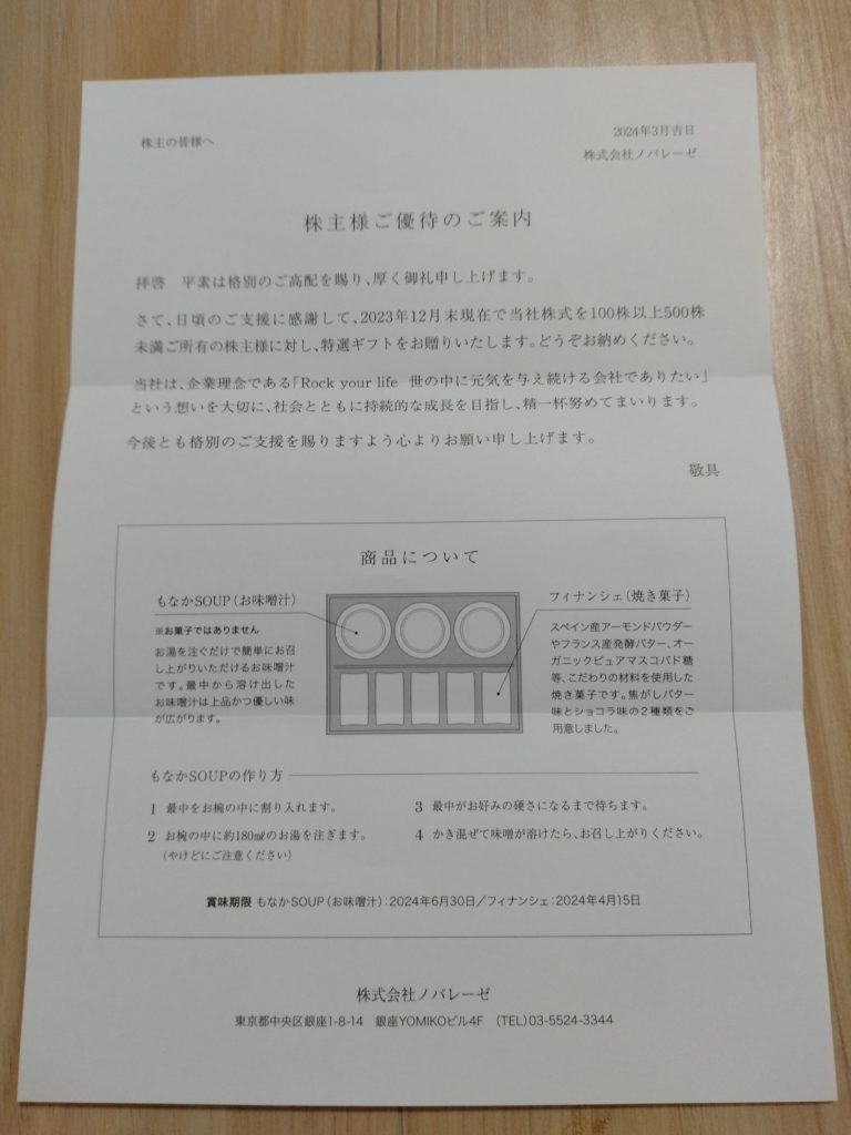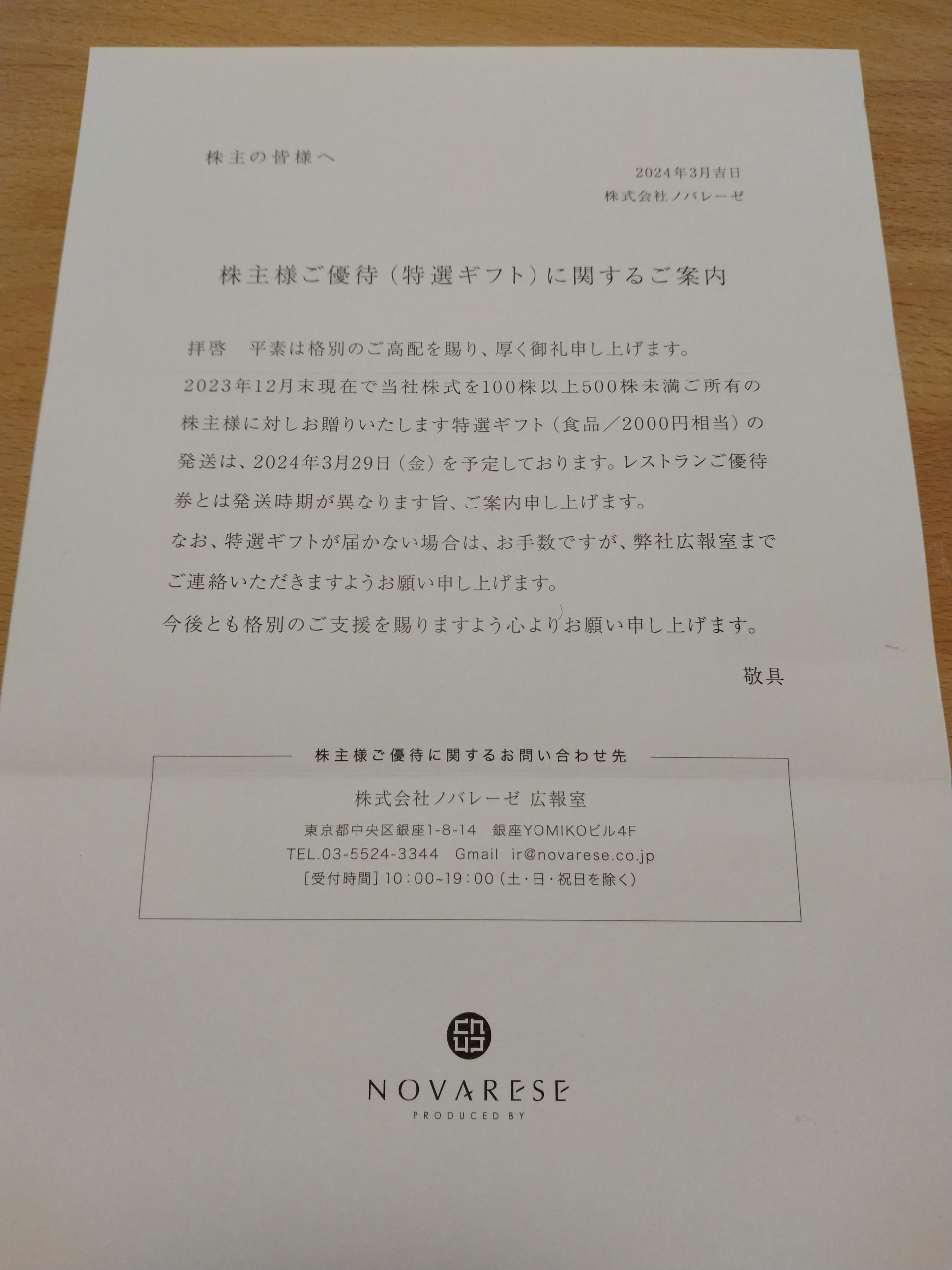 2024/3/18、株主優待の特選ギフトに関するご案内と株主様ご優待券を頂きました。