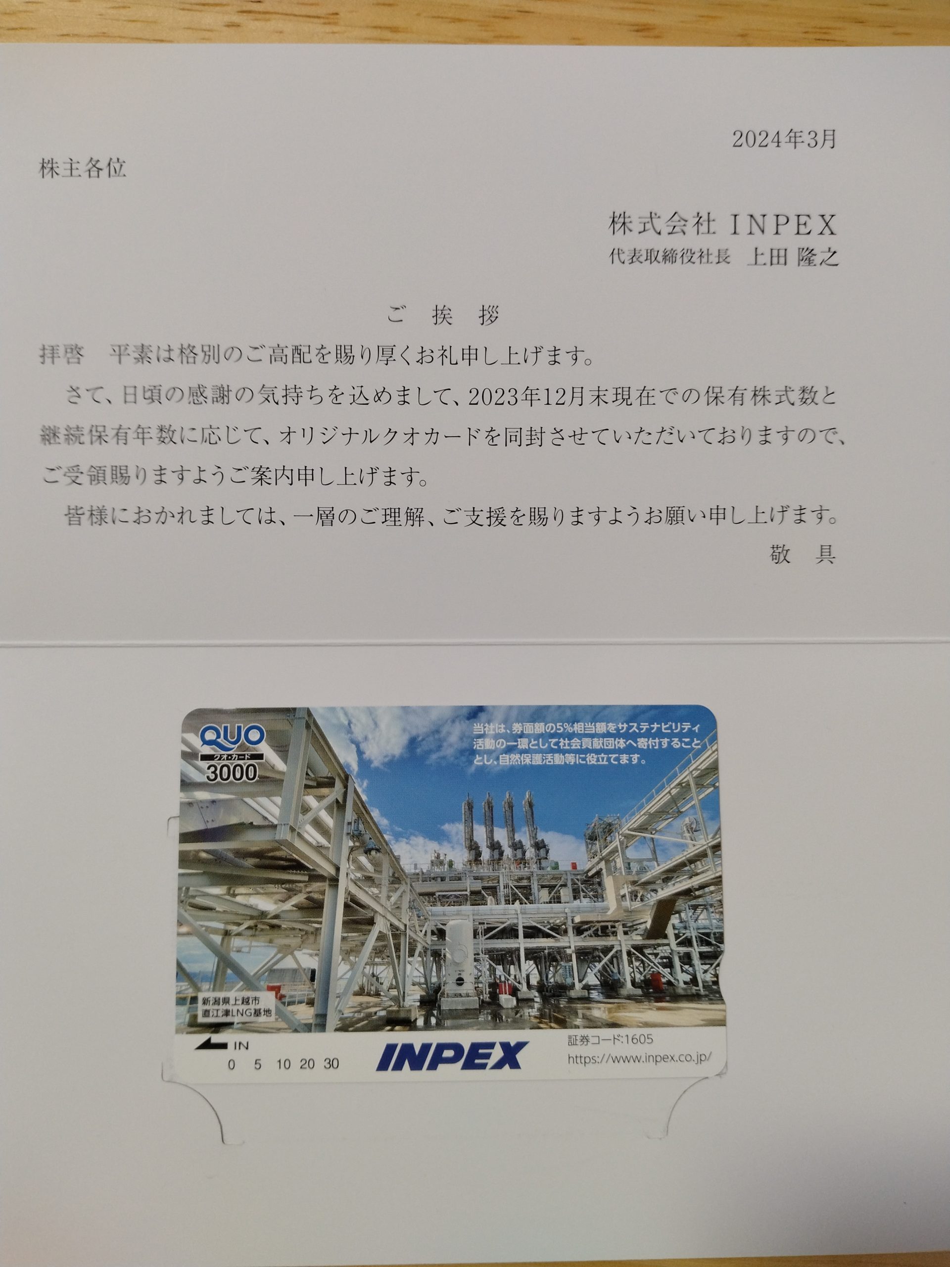 株主優待12月確定2024/3/29、株主優待のQUOカード3,000円分を頂きました!!