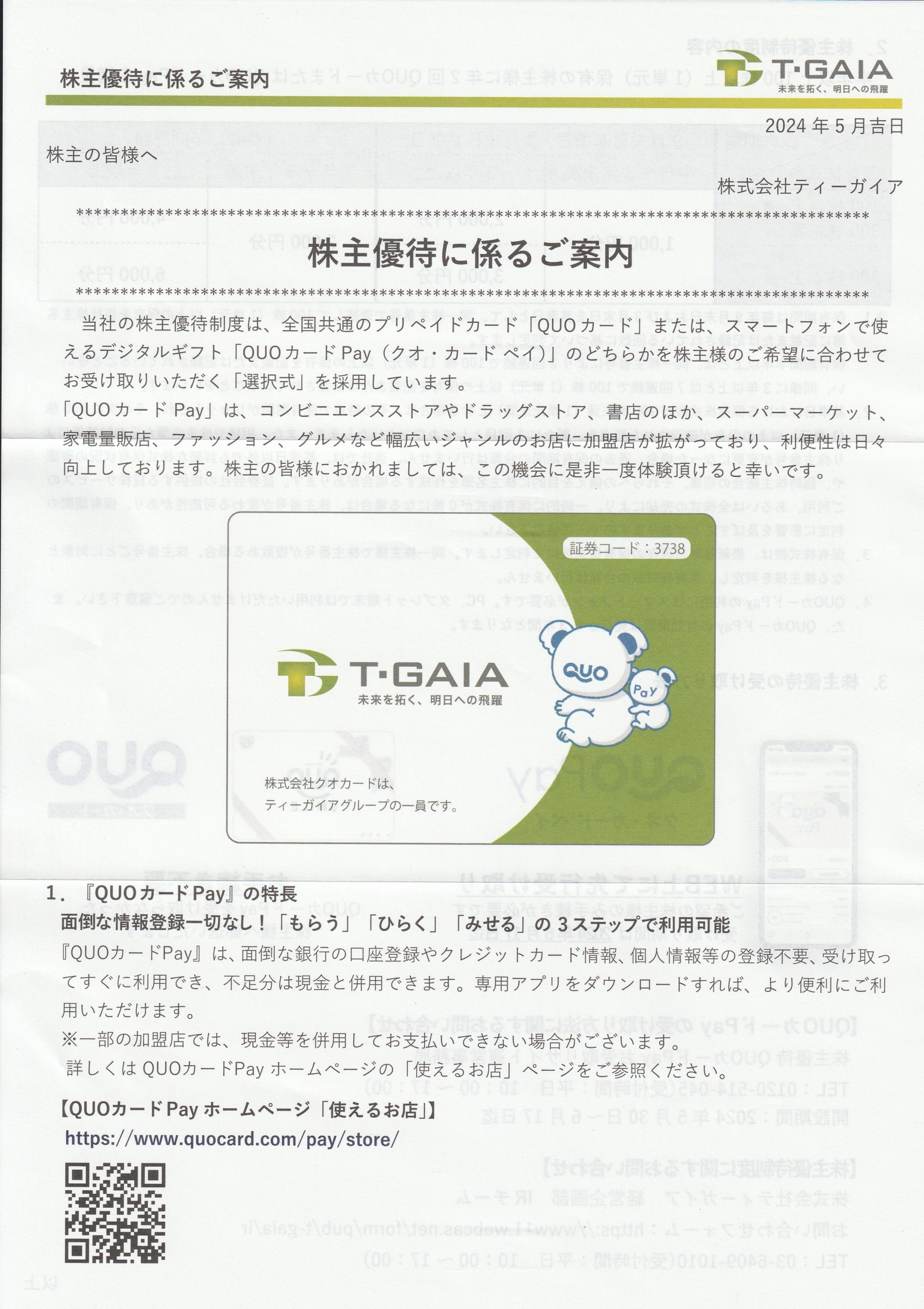 株主優待3月確定2024/5/31、株主優待のQUOカードPay1,000円分を頂きました!!