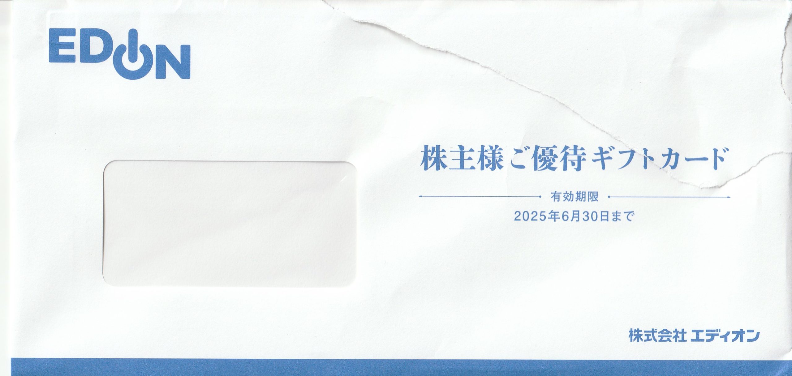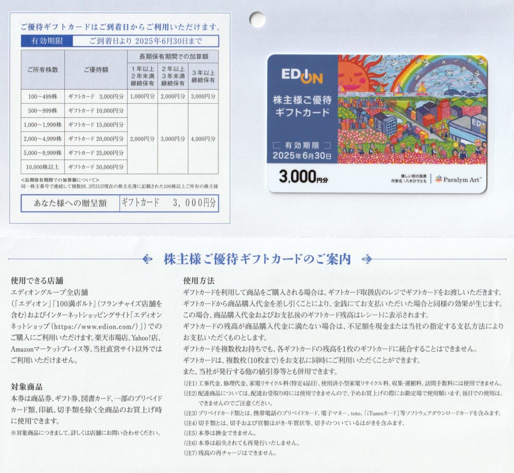 株主優待を頂きました「ギフトカード」【証券コード2730】【株式会社エディオンさん】 株主優待3月確定 X Facebook はてブ LINE コピー 2024.06.11 2024/6/11、株主優待のギフトカード3,000円分を頂きました!! 100株保有で長期保有がないので3,000円分になります。 株式会社エディオンさんありがとう!! 今回は3,000円分ですが、長期保有で3年後にはMAX6,000円になりますね。 株価はきにせずがっちりホールドですね。
