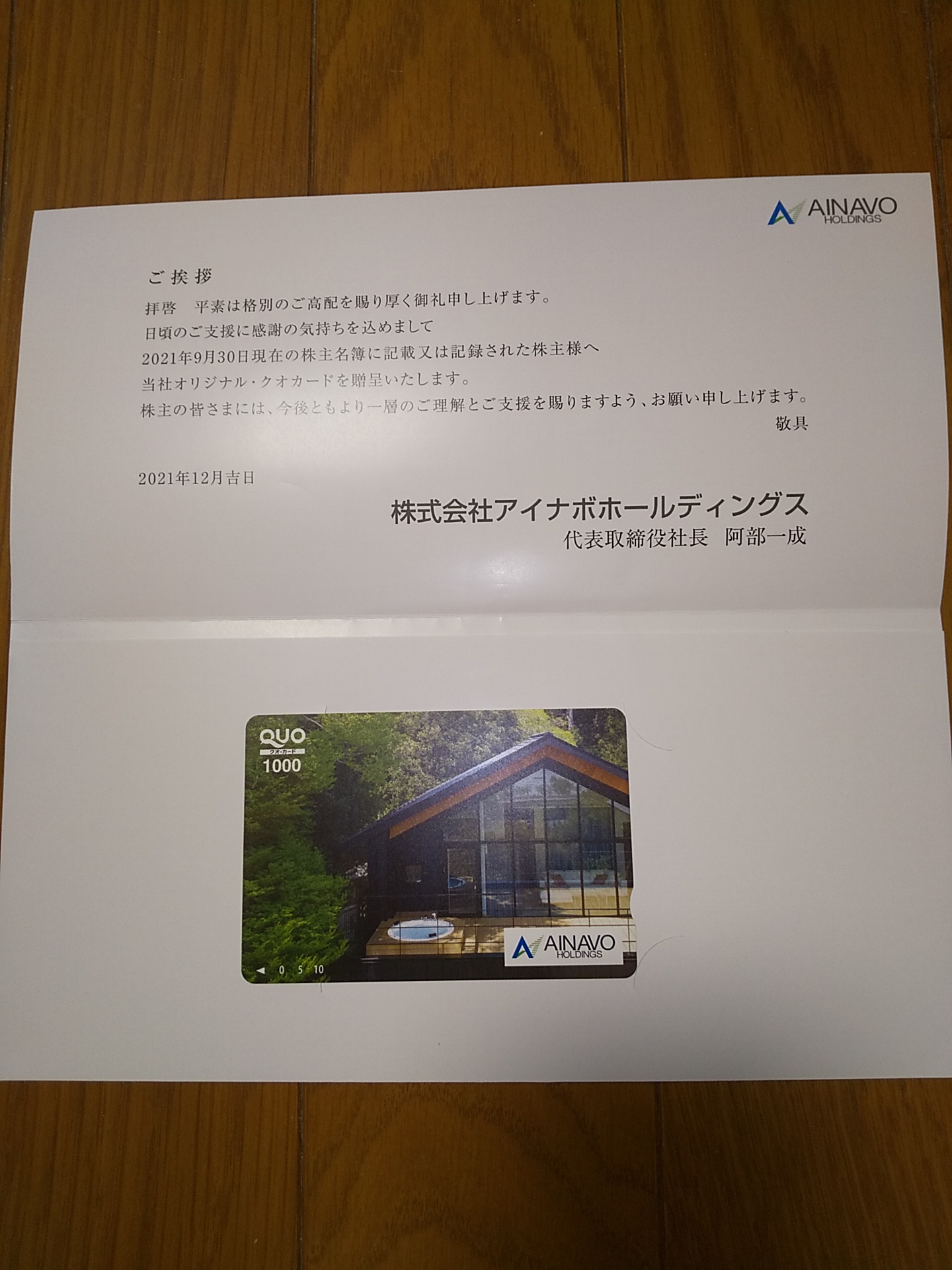株主優待を頂きましたQUOカード【証券コード7539】【株式会社アイナボホールディングスさん】 株主優待9月確定 X Facebook はてブ LINE コピー 2021.12.03 2021/12/3、QUOカード1,000円分を頂きました!! 100株保有で、保有期間にかかわらず1,000円分(年1回)になります。 株式会社アイナボホールディングスさんありがとう!!