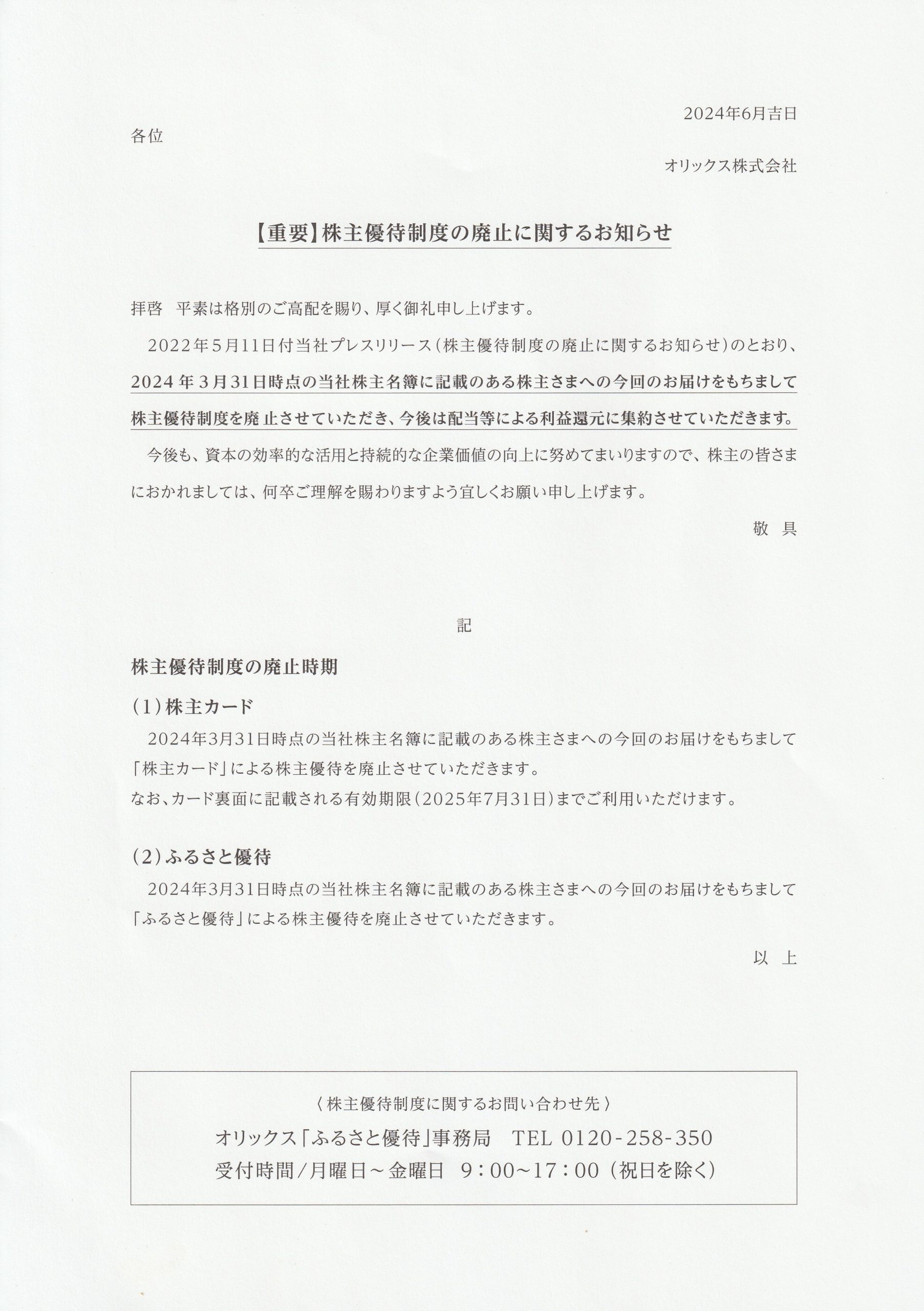 お手紙もついており、今回が最後の優待の旨の記載もあります。