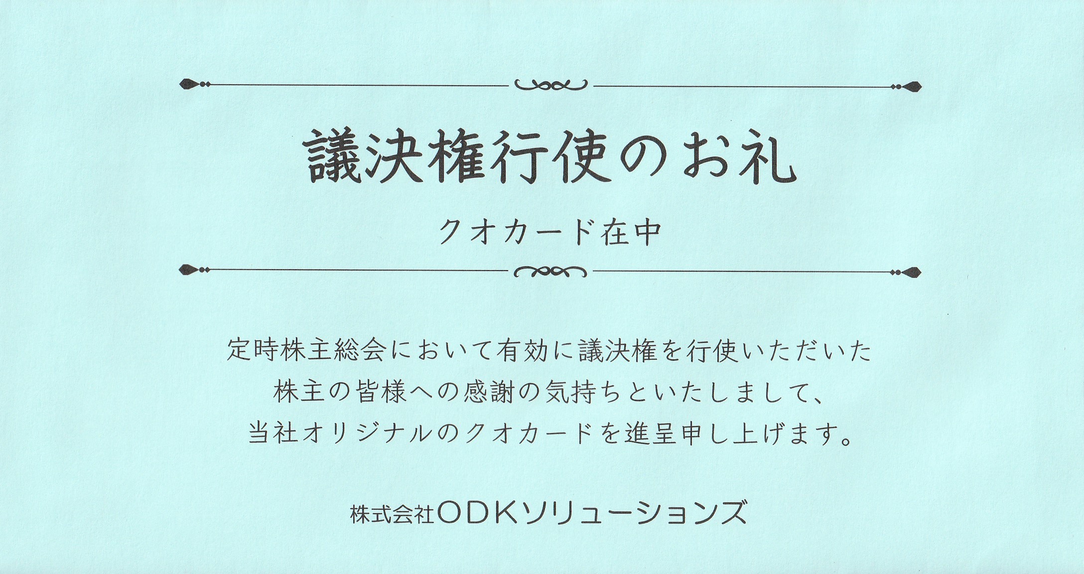 隠れ株主優待を頂きました「クオカード」【証券コード3839】【株式会社ODKソリューションズさん】 隠れ優待 X Facebook はてブ LINE コピー 2024.07.22 2024/7/22、本日クオカード500円分を頂きました!! 議決権行使の隠れ優待です。 かれこれ3回目のゲットです。 株価は全く冴えませんが、地道に配当・優待をもらうしかないですね。 株式会社ODKソリューションズさんありがとう!!