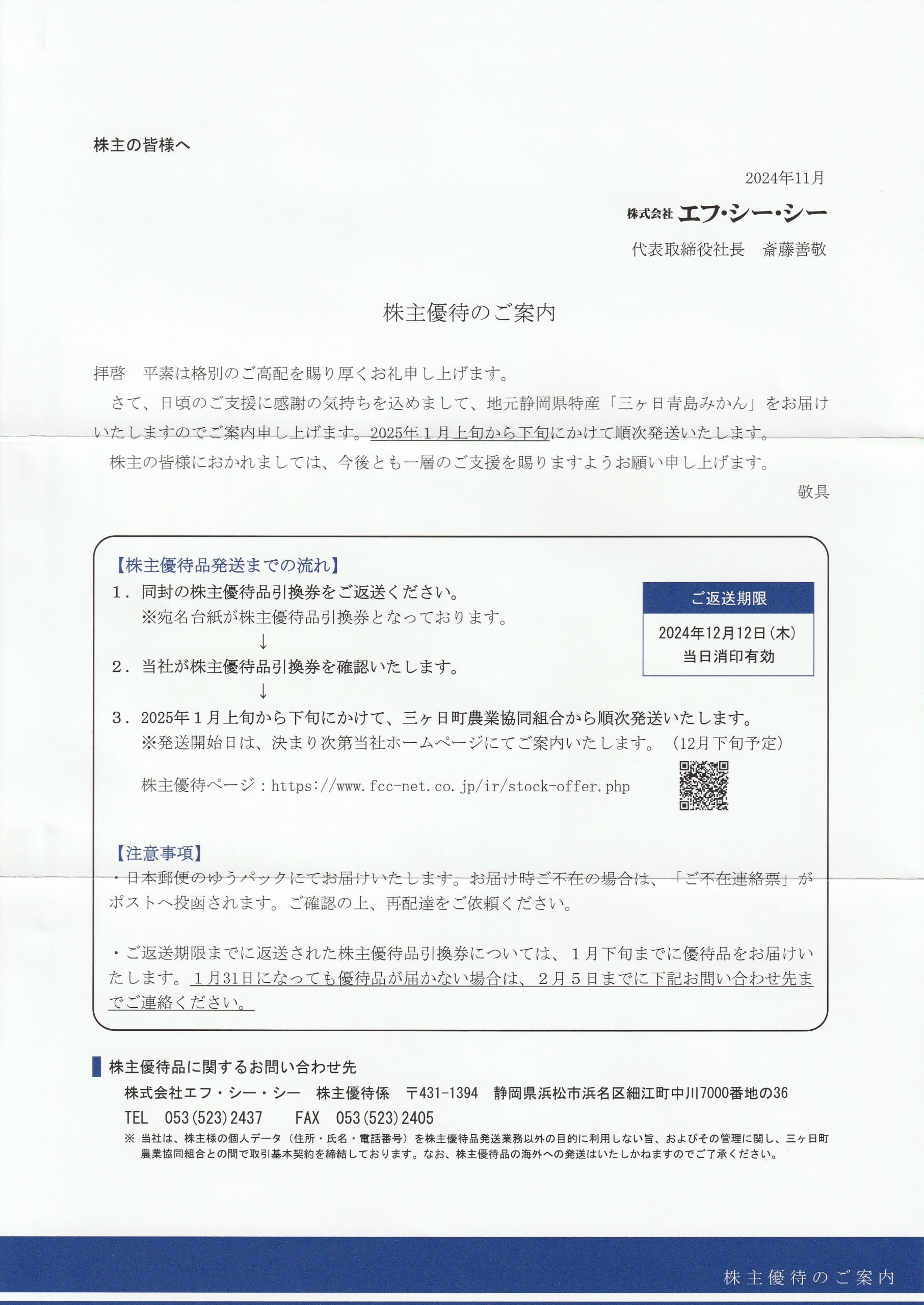株主優待のご案内を頂きました【証券コード7296】【株式会社エフ・シー・シーさん】 株主優待9月確定 X Facebook はてブ LINE コピー 2024.11.17 2024/11/15、株主優待の「みかん引換券」2,500円相当分を頂きました!! 今回が2回目の「みかん」GETになります。 株式会社エフ・シー・シーさんありがとう!! 株価も順調で安心してホールドできます。 過去の配当情報はコチラ!!