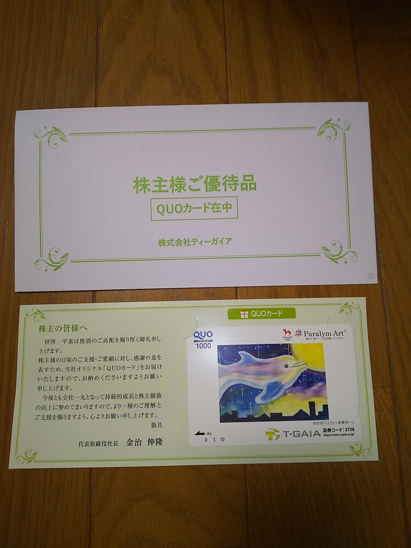 株主優待を頂きましたQUOカード【証券コード3738】【株式会社ティーガイアさん】 株主優待9月確定 X Facebook はてブ LINE コピー 2021.12.06 2021/12/6、株主優待のQUOカード1,000円分を頂きました!! 株式会社ティーガイアさんありがとう!!、と言いたい所ですが、 株価を何とかして欲しいですね。よく下がるなぁ・・・