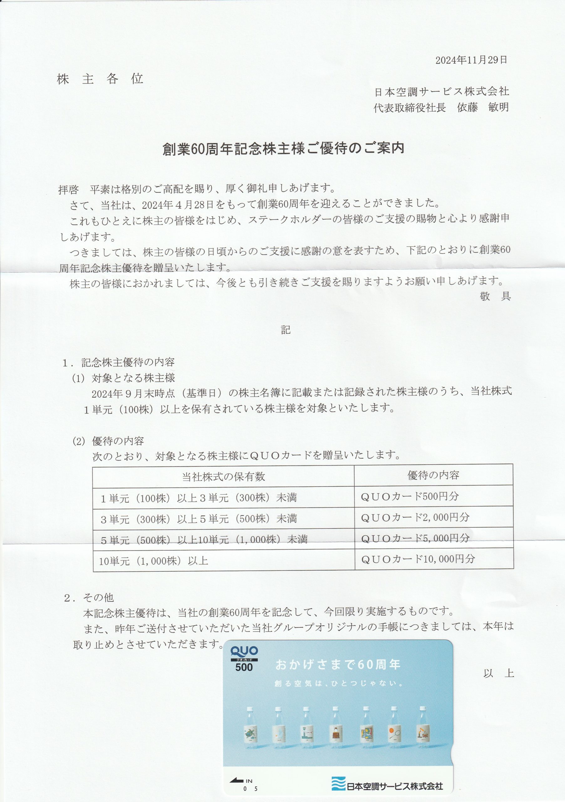 株主優待を頂きました「クオカード」【証券コード4658】【日本空調サービス株式会社さん】 株主優待9月確定 X Facebook はてブ LINE コピー 2024.12.07 2024/12/2、株主優待のクオカード500円分を頂きました!! 創業60周年を記念した株主優待とのことです。 優待が来るなんてまったく知らなかったので、うれしいです。 日本空調サービス株式会社さんありがとう!! 過去の配当情報はコチラ!!
