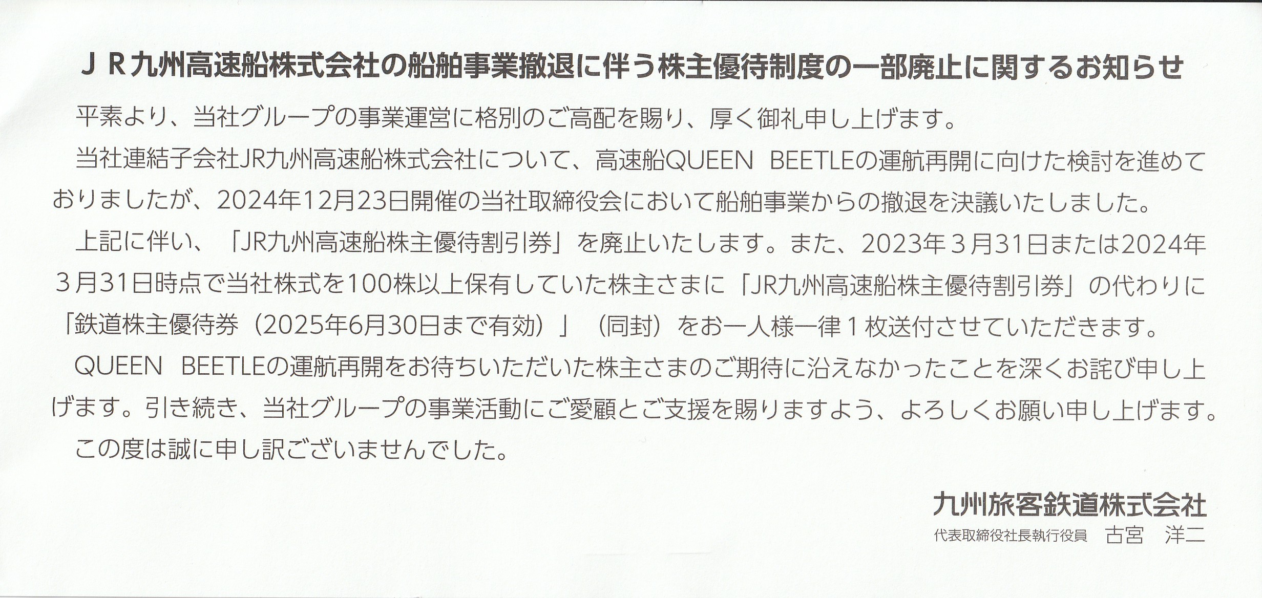 株主優待を頂きました「1日乗車券1枚」【証券コード9142】【九州旅客鉄道株式会社】 隠れ優待 X Facebook はてブ LINE コピー 2025.02.12 2025/2/12、何の前触れもなく、1日乗車券を1枚頂きました。 お手紙をみると、船舶事業からの撤退にともなう措置なんですね。 不謹慎かもしれませんが、個人的には鉄道の1日乗車券のほうがありがたいので、 ちょっと嬉しいです (^^)/