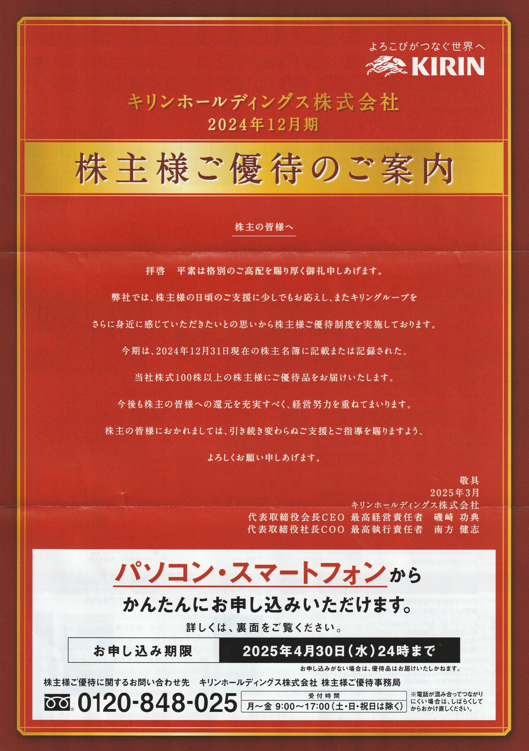 2025/3/11、株主優待の「株主様ご優待のご案内」を頂きました!!