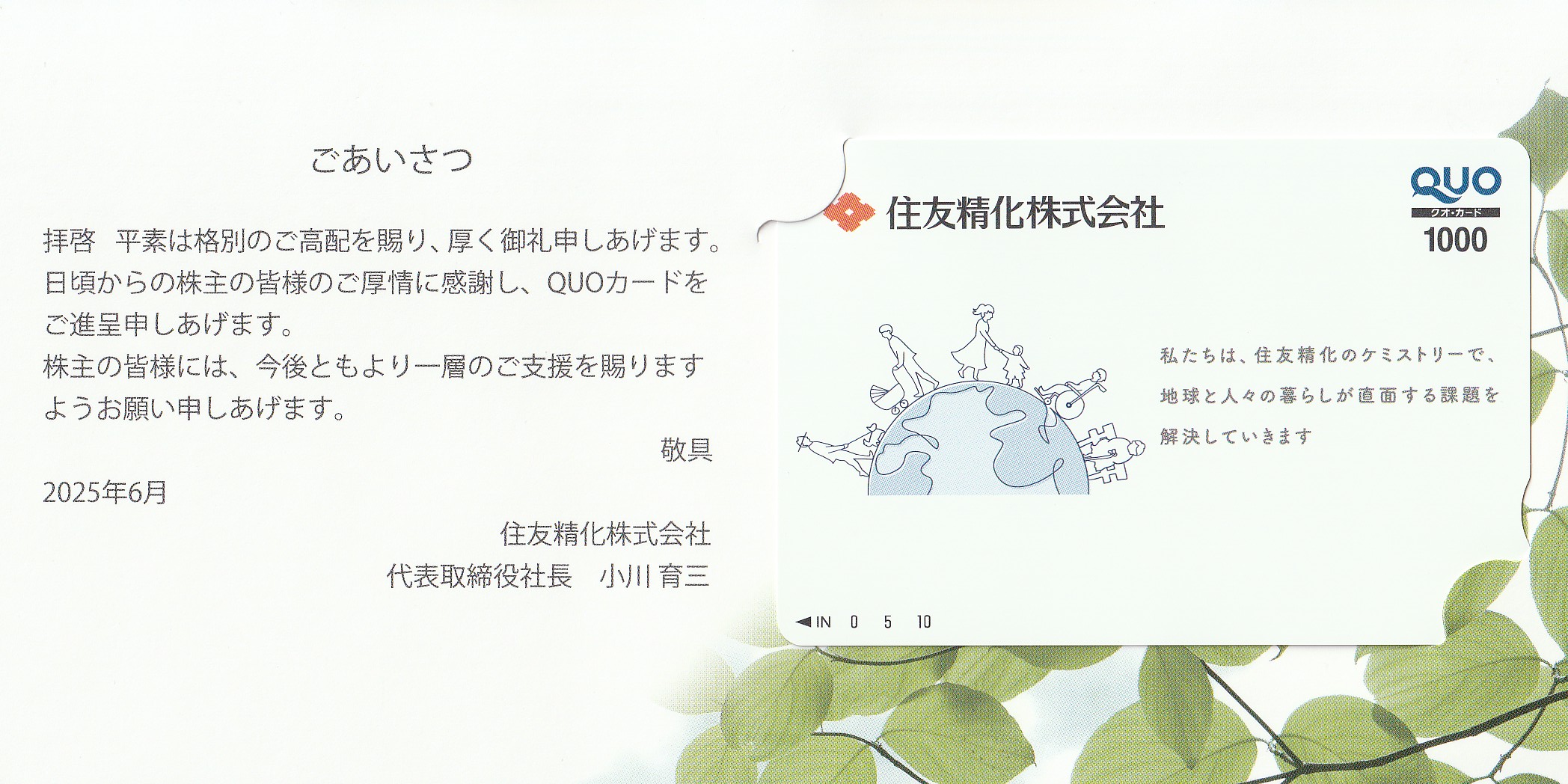 株主優待を頂きました「クオカード」【証券コード4008】【住友精化株式会社さん】 株主優待3月確定 X Facebook はてブ LINE コピー 2025.06.072025.06.15 2025/6/4、株主優待のクオカード1,000円分を頂きました!! 住友精化株式会社さんありがとう!! 過去の配当情報はコチラ!!