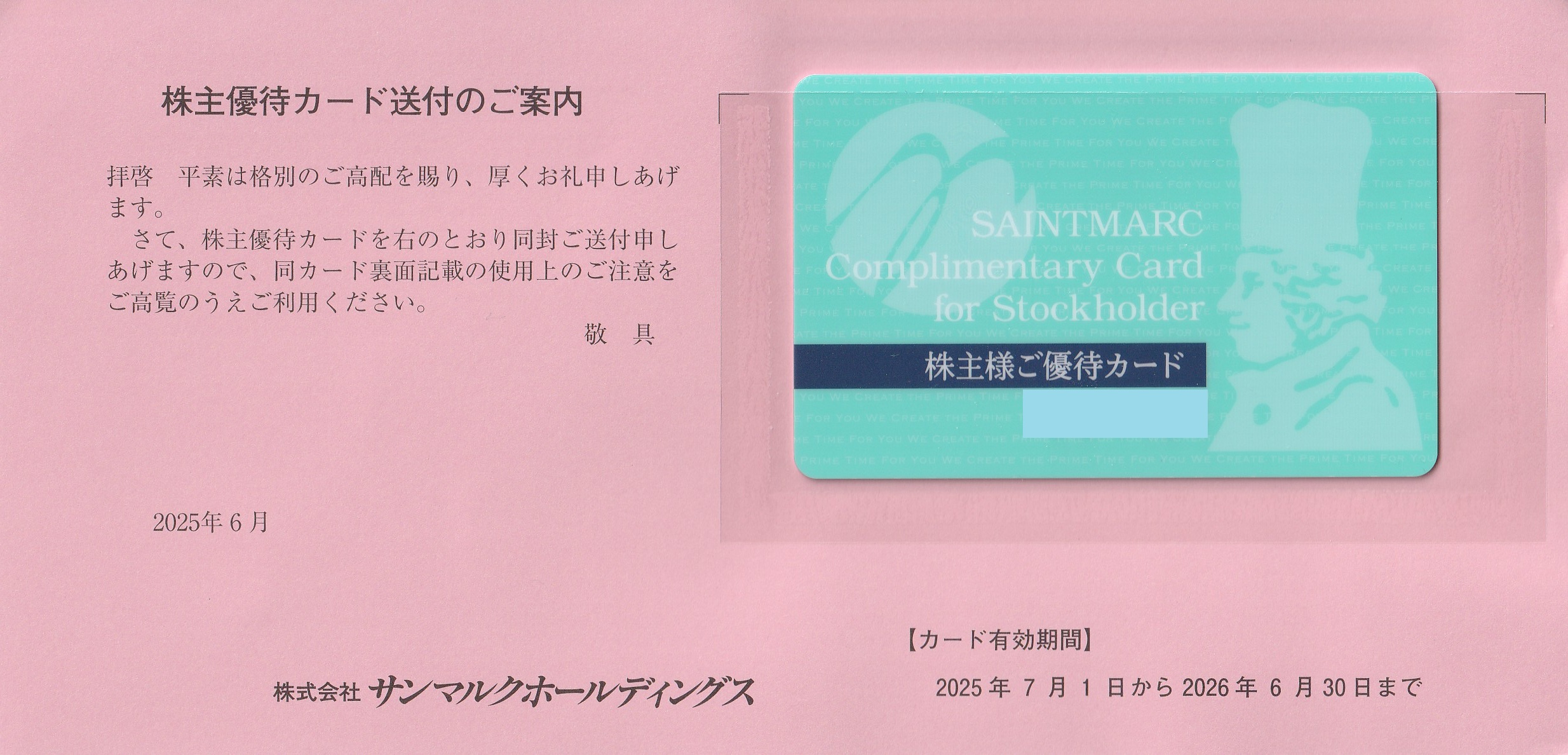 株主優待を頂きました「株主優待カード」【証券コード3395】【株式会社サンマルクホールディングスさん】 株主優待3月確定 X Facebook はてブ LINE コピー 2025.06.15 2025/6/12、株主優待の優待カードを頂きました!! 100株以上の保有で、1枚もらえます。 ほとんど妻が使っております👩 株式会社サンマルクホールディングスさんありがとう!! 過去の配当情報はコチラ!!