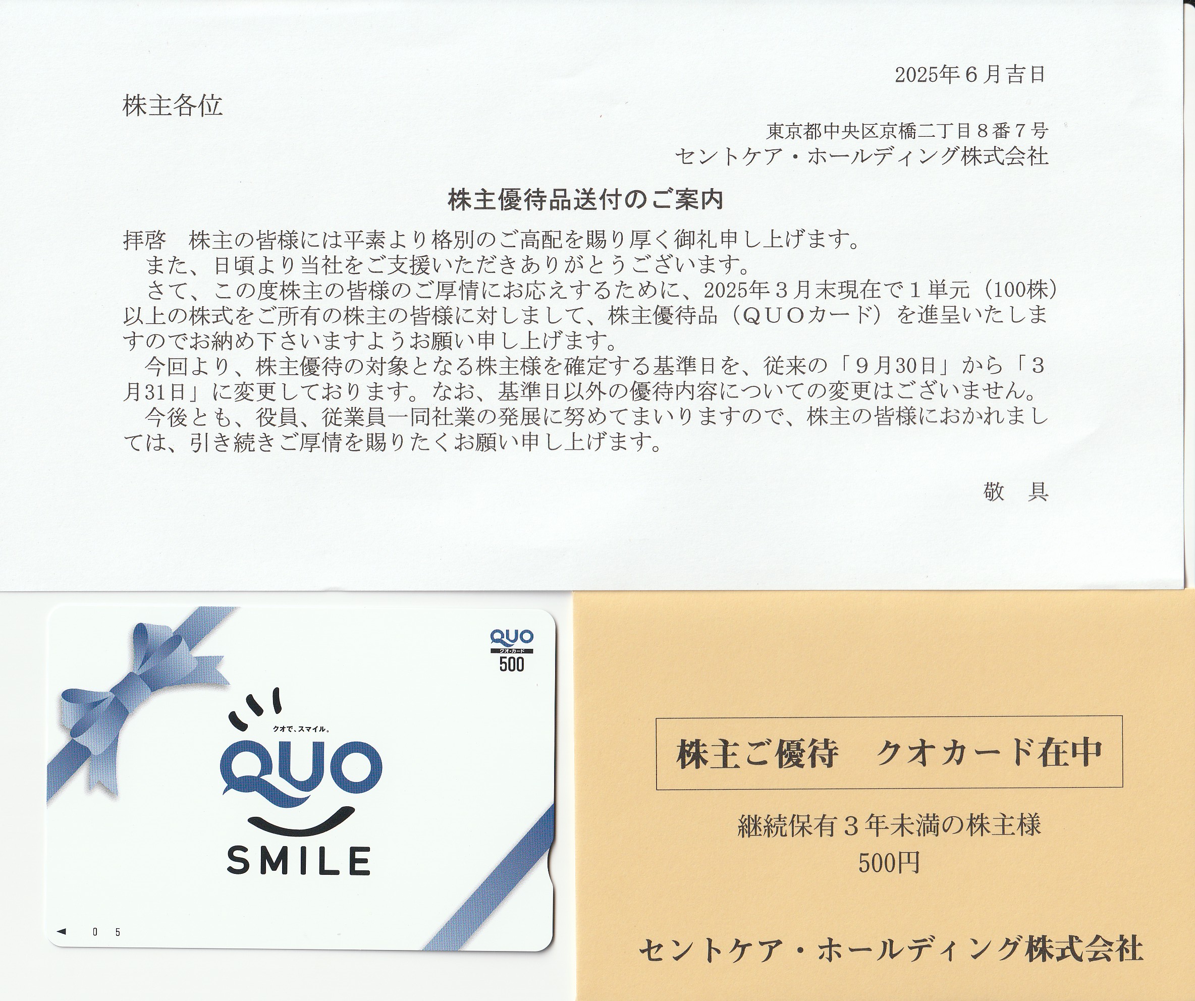 2025/6/12、株主優待のQUOカード500円分を頂きました!!