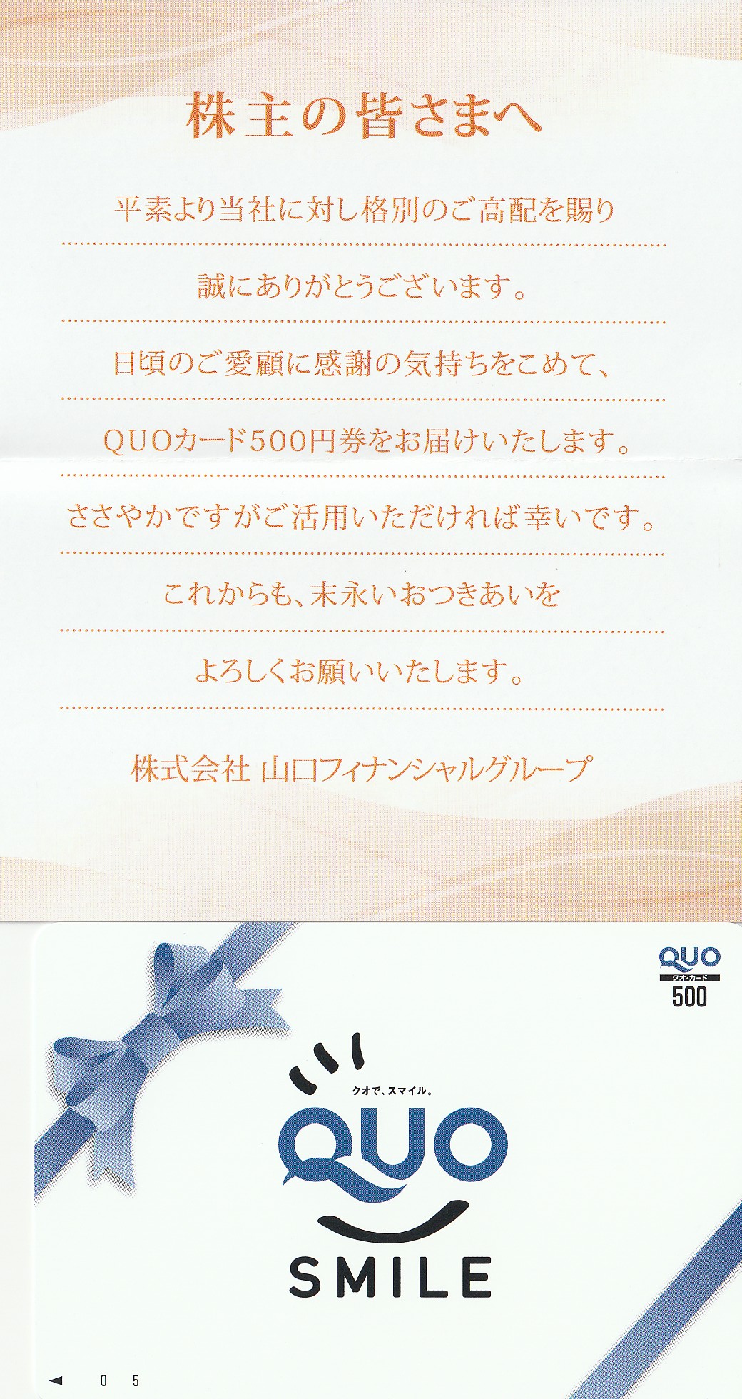 株主優待を頂きました「クオカード」【証券コード8418】【株式会社山口フィナンシャルグループさん】 株主優待3月確定 X Facebook はてブ LINE コピー 2025.06.16 2025/6/16、株主優待のクオカード500円分を頂きました!! 今回が3回目のGETです。 株式会社山口フィナンシャルグループさんありがとう!! 過去の配当情報はコチラ!!