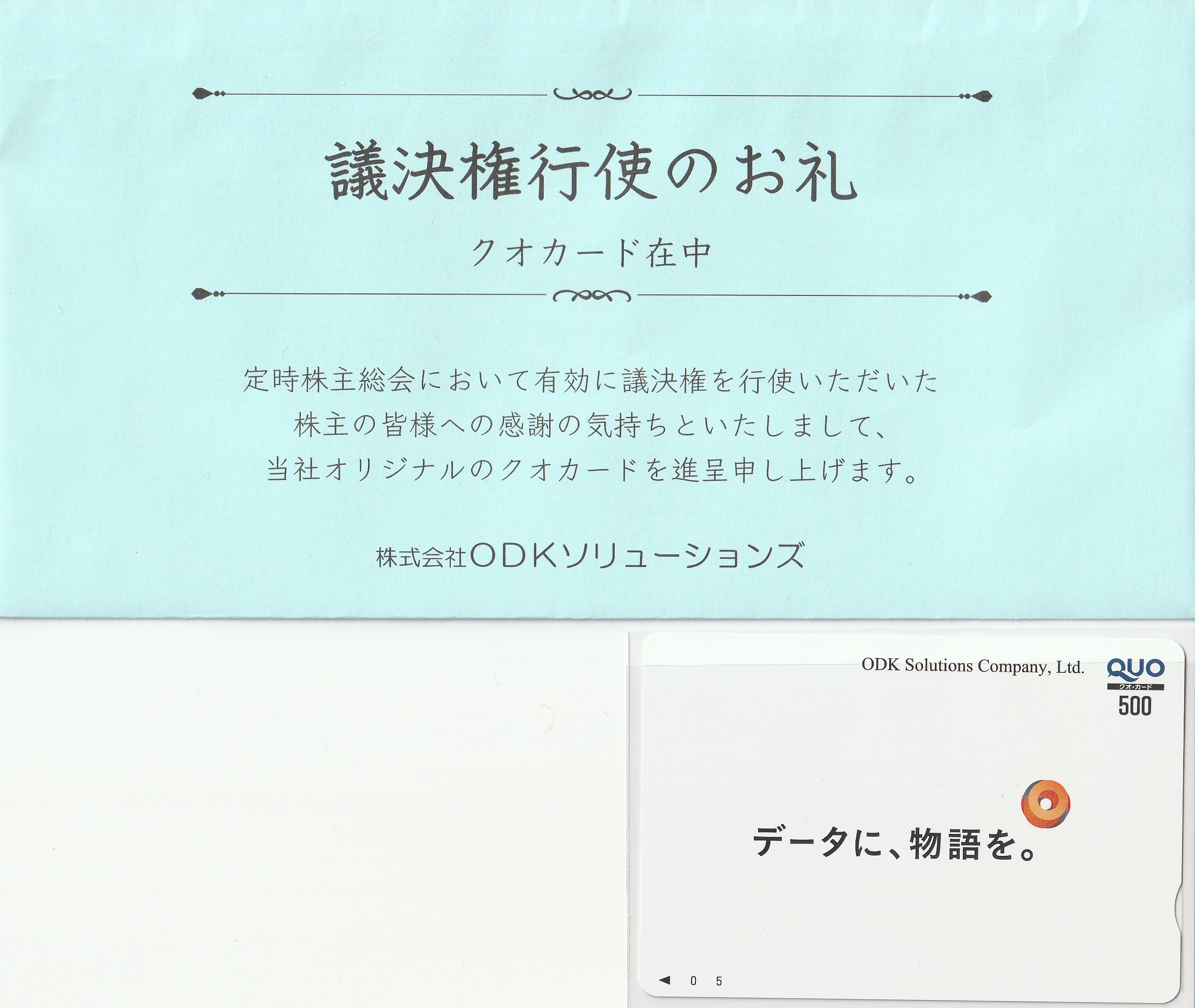 隠れ株主優待を頂きました「クオカード」【証券コード3839】【株式会社ODKソリューションズさん】 隠れ優待 X Facebook はてブ LINE コピー 2025.07.26 2025/7/22、クオカード500円分を頂きました!! 議決権行使の隠れ優待です。 と、言ってもヤフーファイナンスに、議決権行使したら贈呈する旨、がっつり書いてあるので言うほど隠れ優待ではないですね😢 引き続き、株価は全く冴えませんが、地道に配当・優待を貰って含み損を穴埋めしていきます。 株式会社ODKソリューションズさんありがとう!!