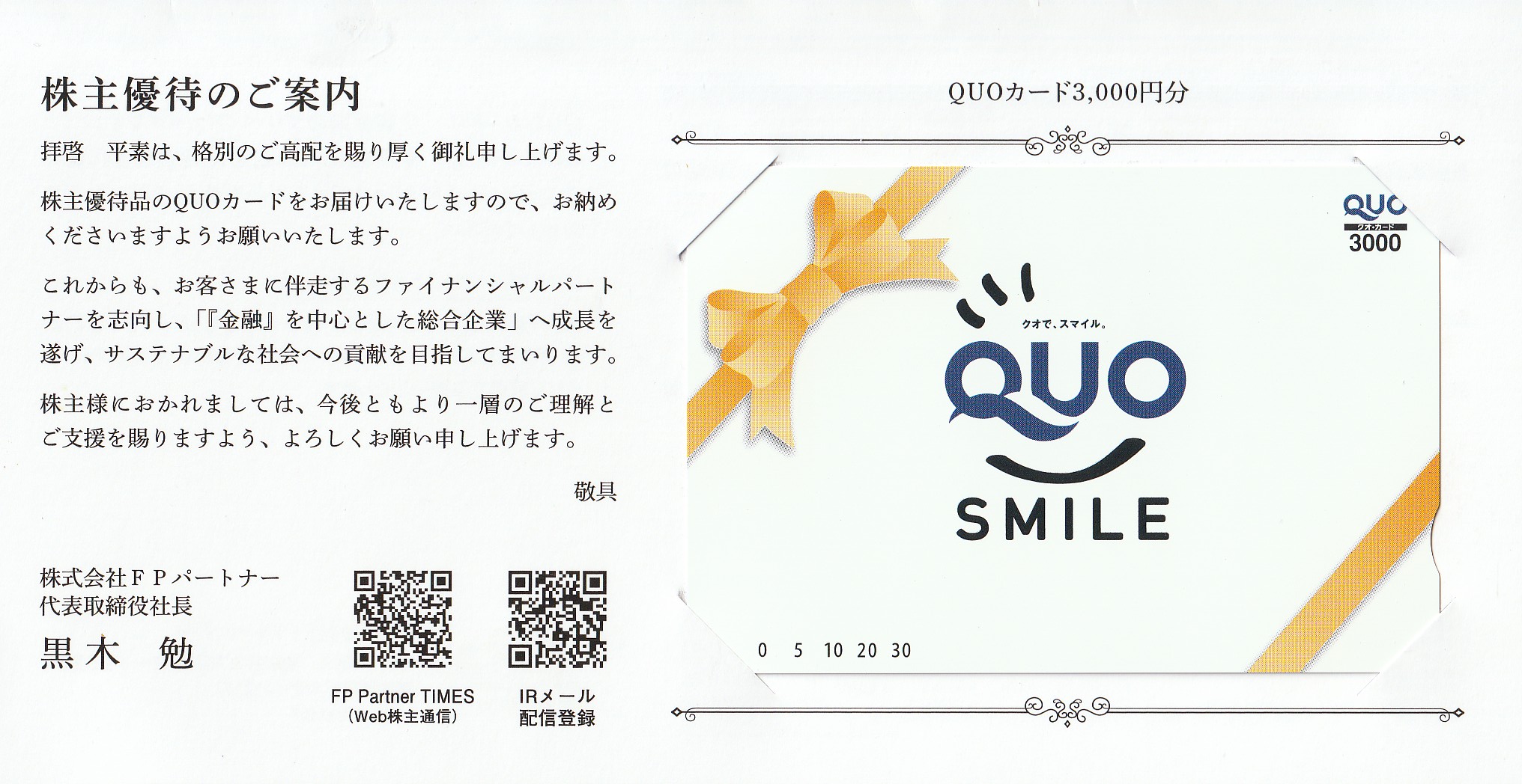 2025/8/8だったかな?、株主優待のクオカード3,000円分を頂きました!!