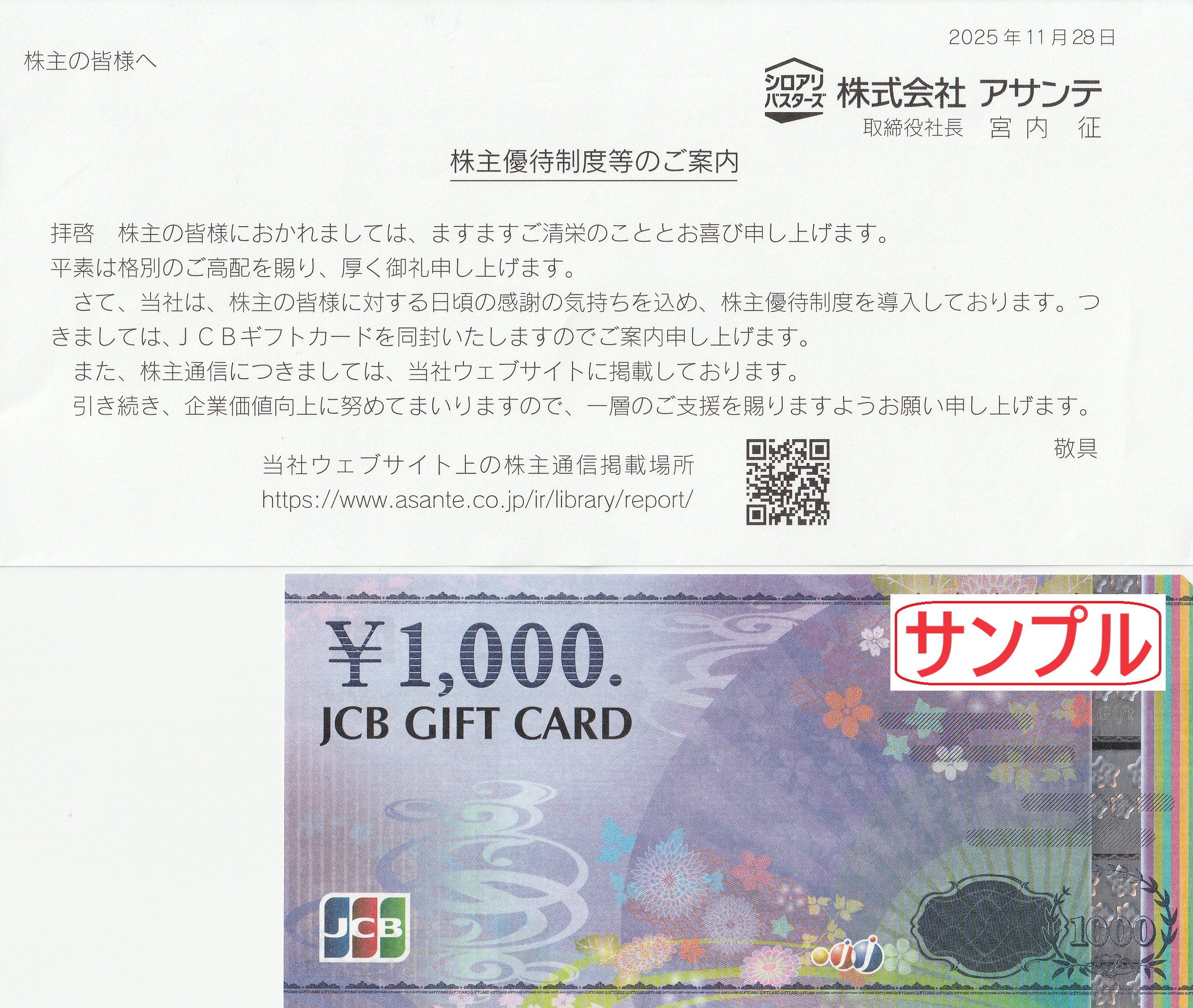 株主優待を頂きました「ギフトカード」【証券コード6073】【株式会社アサンテさん】 株主優待9月確定 X Facebook はてブ LINE コピー 2025.12.07 2025/12/2、株主優待の「JCBギフトカード」1,000円分を頂きました!! 今後も、優待継続お願いします。 株式会社アサンテさんありがとう!! 過去の配当情報はコチラ!!