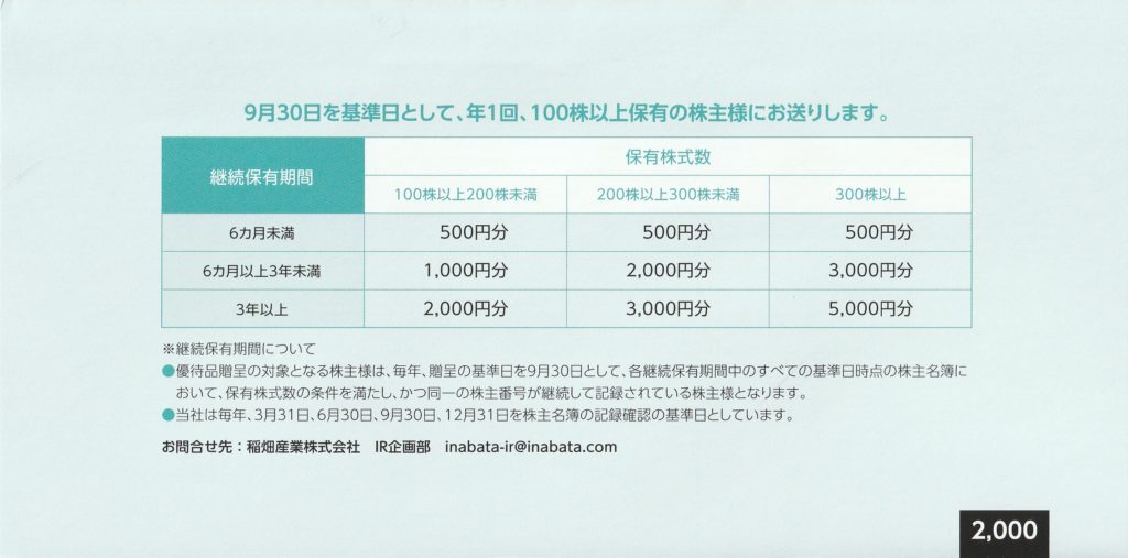 100株の保有で、継続保有期間が3年以上なので、2,000円分になります😊