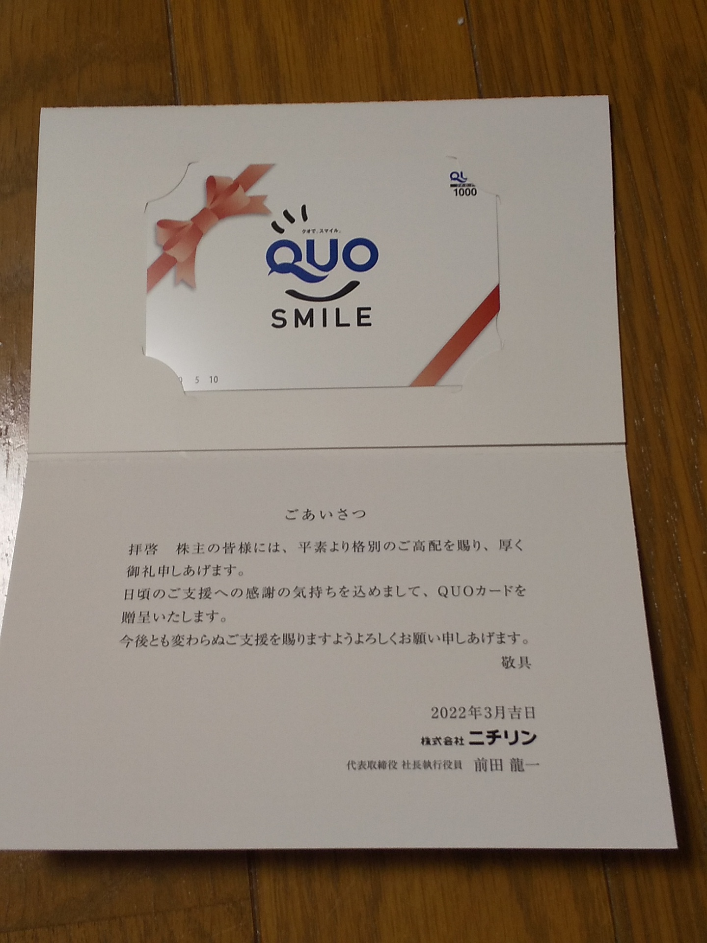 株主優待を頂きましたQUOカード【証券コード5184】【株式会社ニチリンさん】 株主優待12月確定 X Facebook はてブ LINE コピー 2022.03.30 2022/3/30、株主優待のQUOカード1,000円分を頂きました!! (もしかしたら、もうちょっと前に届いていたかもしれません・・・) 100株の保有ですが、株を購入したのが2021年の12月です。 1年以上の継続保有ではないので、貰えないものと思ってました! 株式会社ニチリンさんありがとう!! ほんとに貰っていいのかな?!