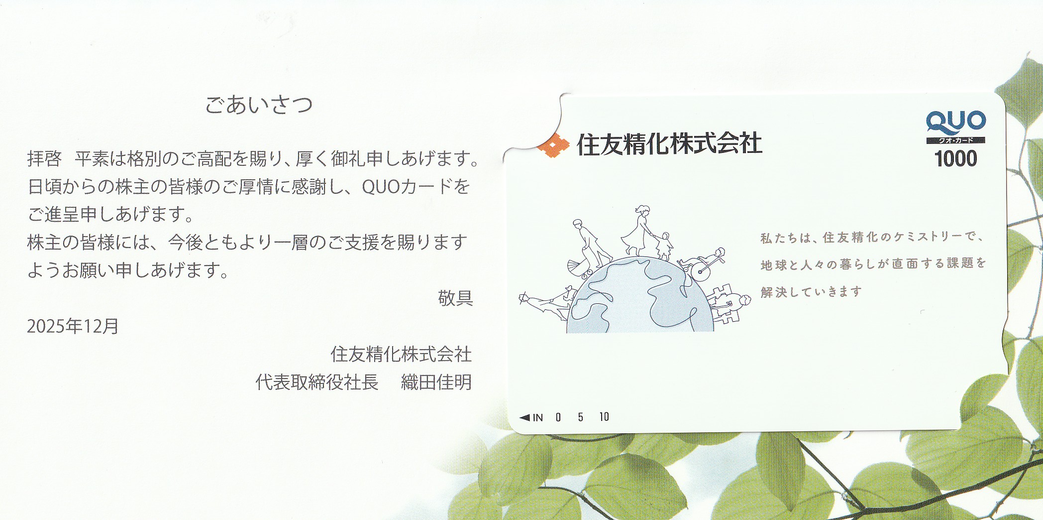 株主優待を頂きました「クオカード」【証券コード4008】【住友精化株式会社さん】 株主優待9月確定 X Facebook はてブ LINE コピー 2025.12.13 2025/12/8、株主優待のクオカード1,000円分を頂きました!! 住友精化株式会社さんありがとう!! 今後も継続して株主優待の提供をお願いします😊 過去の配当情報はコチラ!!