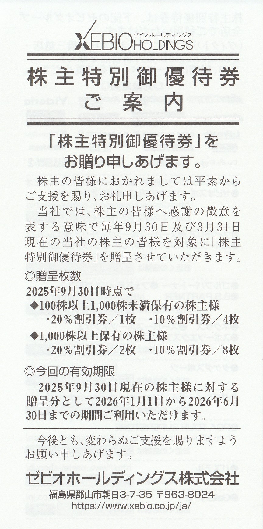 株主優待を頂きました「株主特別御優待券」【証券コード8281】【ゼビオホールディングス株式会社さん】 株主優待9月確定 X Facebook はてブ LINE コピー 2025.12.14 2025/12/12、株主優待の株主特別御優待券を頂きました!! 100株の保有なので、20%OFF券が1枚、10%OFF券が4枚です。 いつもと同じですね😊 ゼビオホールディングス株式会社さんありがとう!! 過去の配当情報はコチラ!!