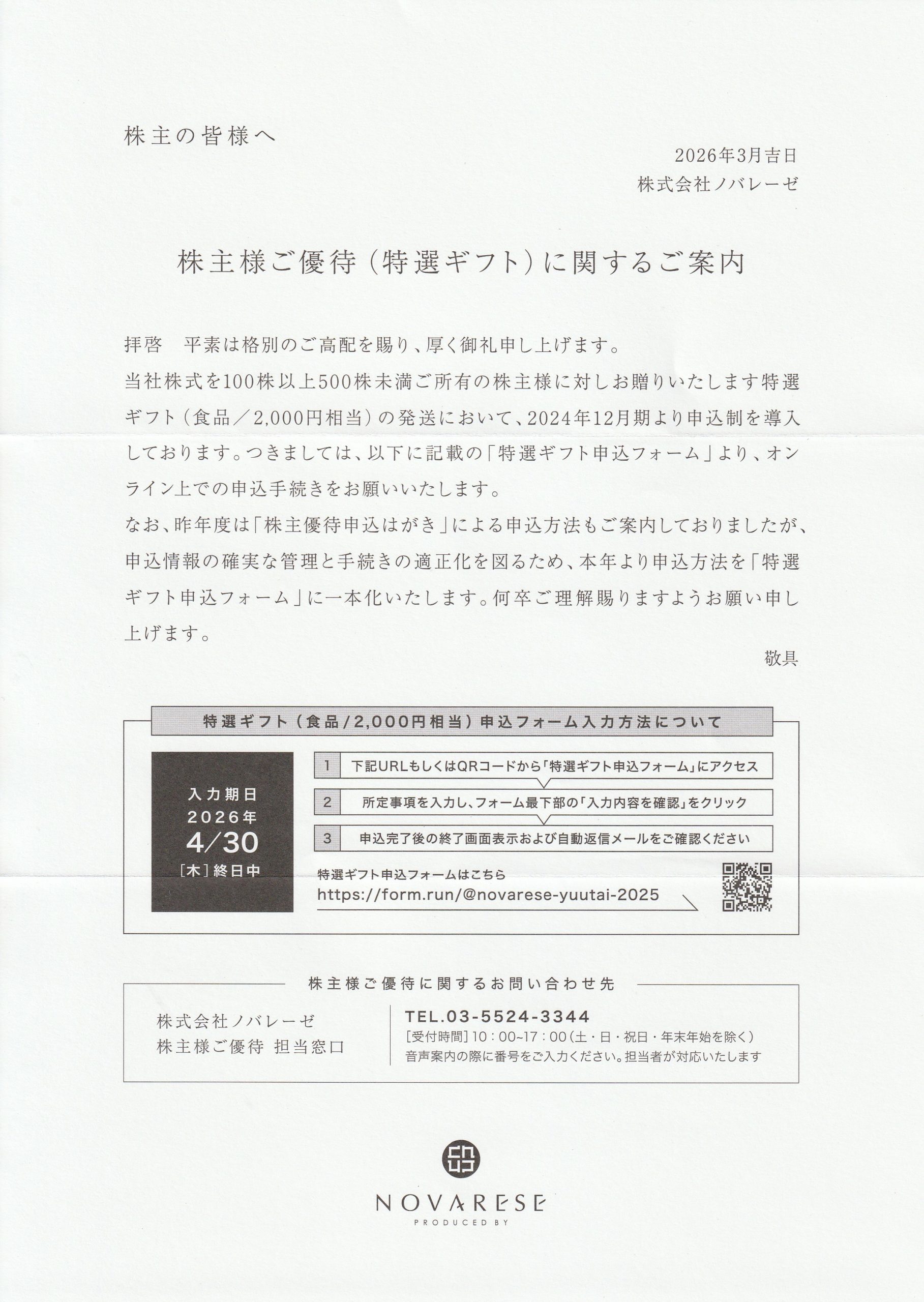 株主優待12月確定2026/3/8、株主優待の特選ギフトに関するご案内とお食事代金割引券頂きました。