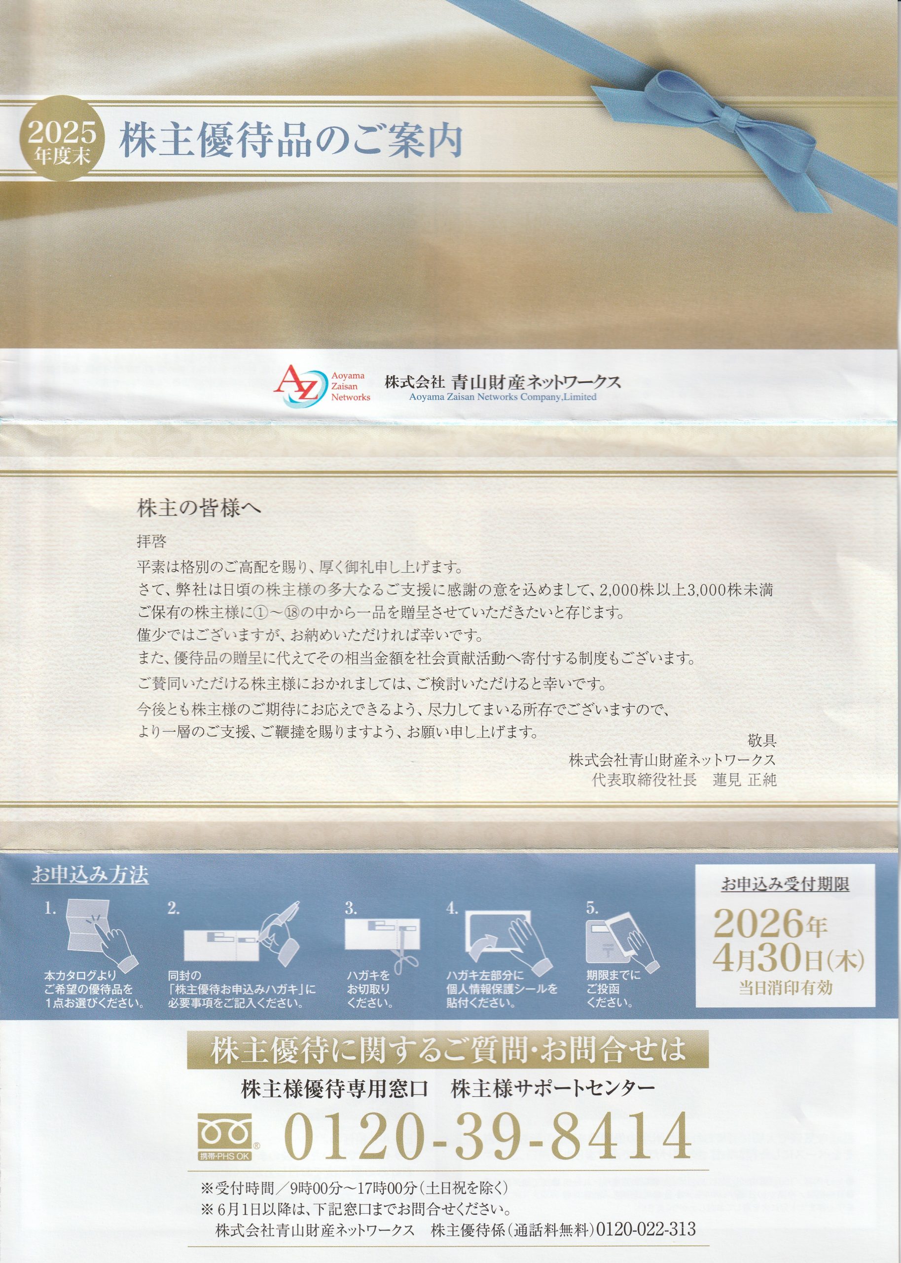 株主優待を頂きました「株主優待品」/【証券コード8929】/【株式会社青山財産ネットワークス】