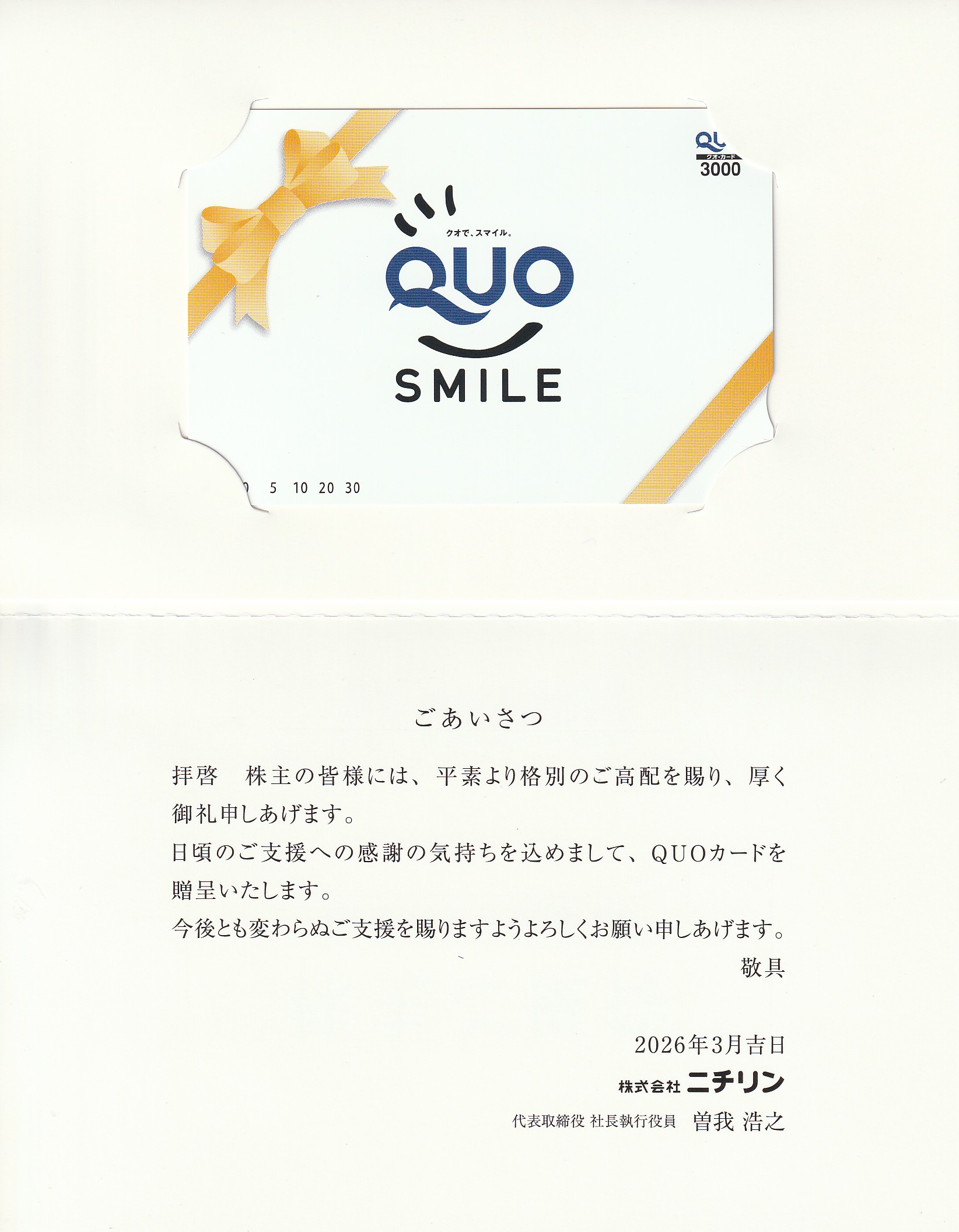 2026/3/31、株主優待のクオカード3,000円分を頂きました!!