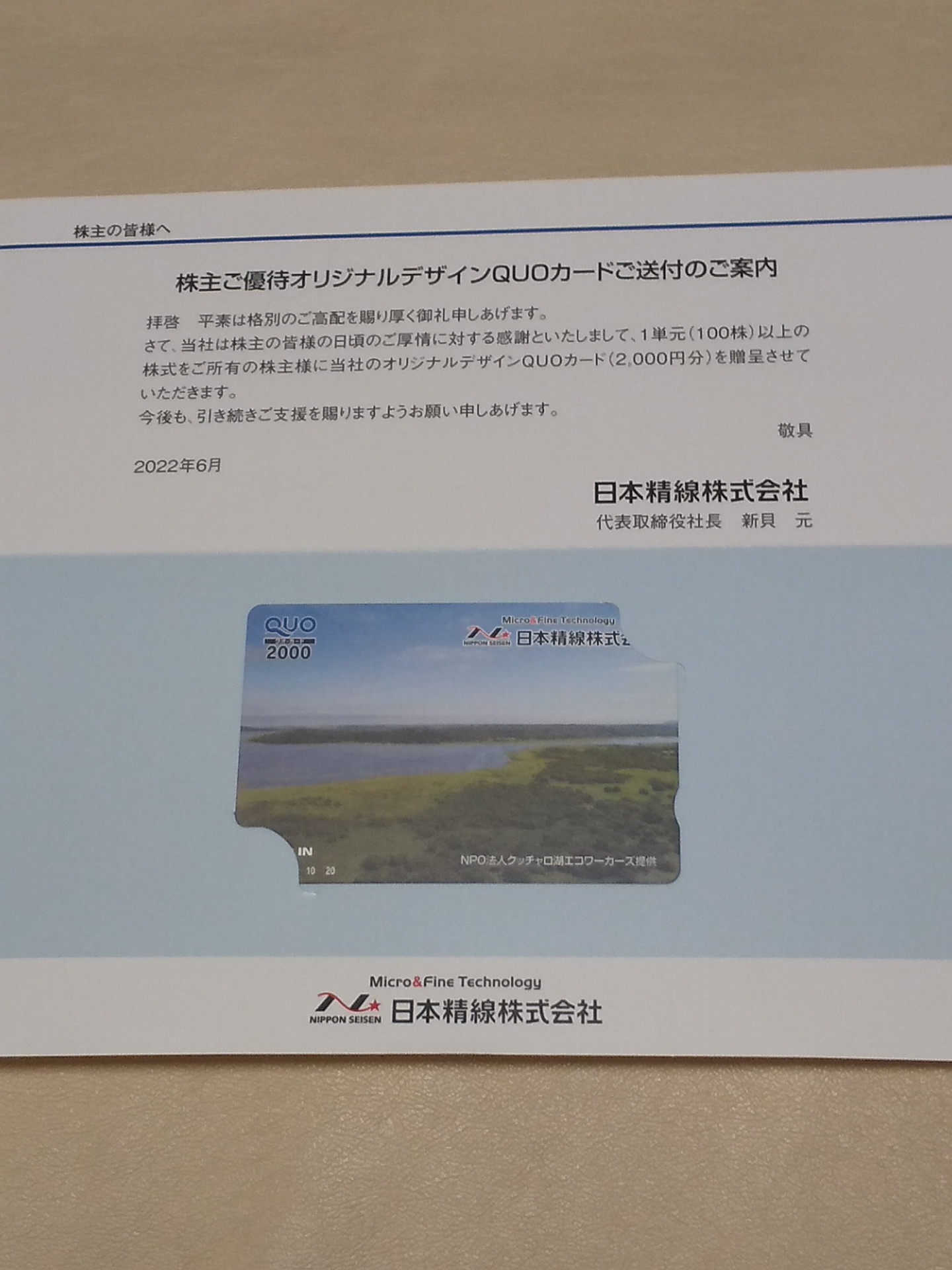 株主優待を頂きましたQUOカード【証券コード5659】【日本精線株式会社さん】 株主優待3月確定 X Facebook はてブ LINE コピー 2022.07.05 2022/7/5、QUOカード2,000円分を頂きました!! 100株の保有なので、2,000円分になります。 日本精線株式会社さんありがとう!! 配当も4.9%くらいあって、クオカードも貰えて助かります! 過去の配当情報はコチラ!!