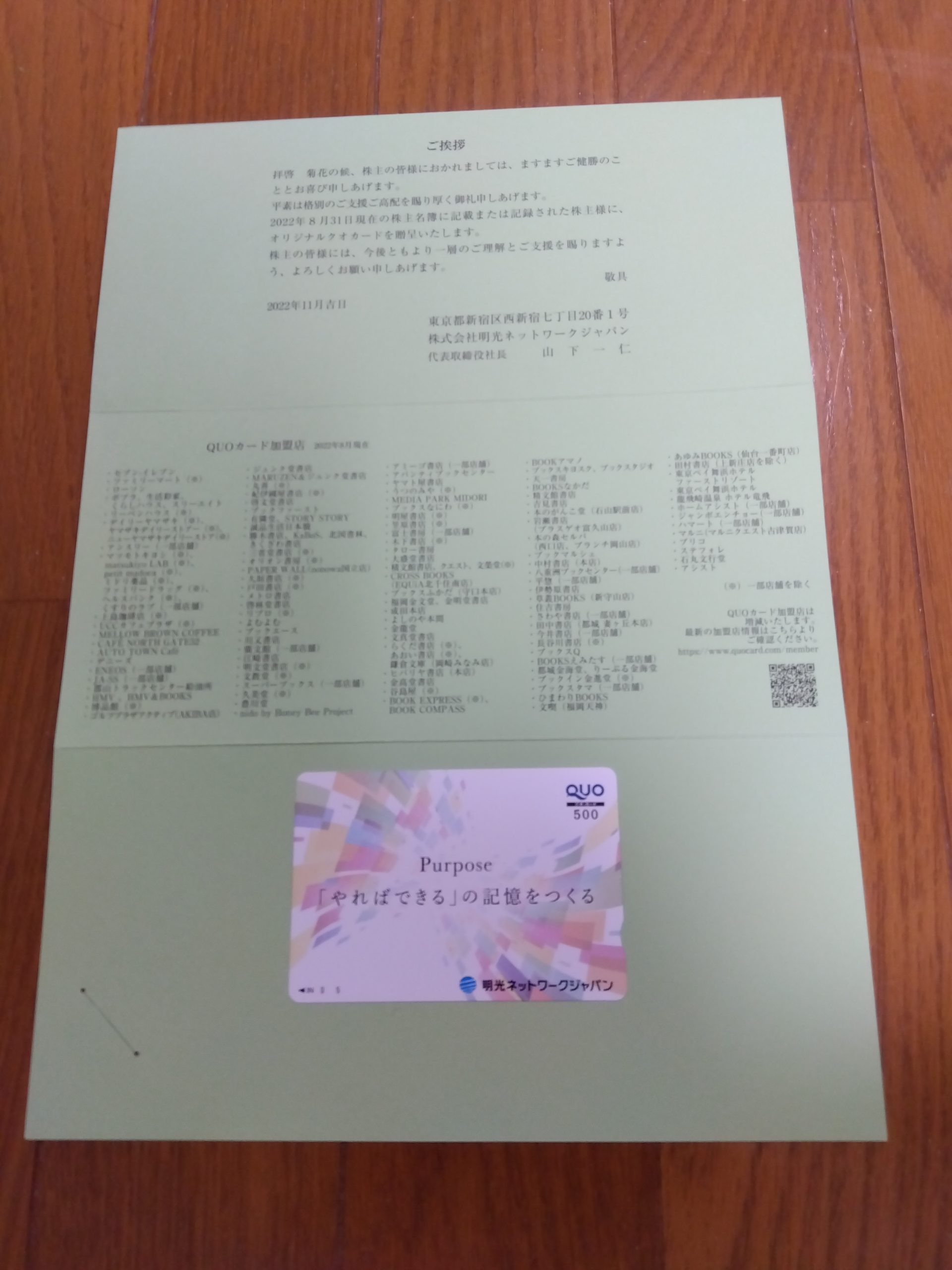 2022/11/21、株主優待(QUOカード500円分)を頂きました!!