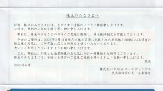 2025/6/30、株主優待のご案内を頂きました!!500株の保有で、今回、保有期間が3年以上になりましたので、2,000ポイントのゲットになります😊今回、クオカード1,000円分を2枚頂くことにしました。日工株式会社さんありがとう!!今回...