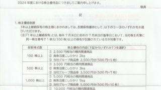 2025/9/16だったかな?、株主優待制度についてのご案内を頂きました!100株の保有なので、2,500円相当分になります。お肉関連・お米(2kg)・グループ商品券の中から一品選択できます。今までお肉ばっかりでしたが、今回は南魚沼産こしひ...