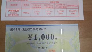 2021/11/22、お買物優待券3,000円分を頂きました!!内訳は、100株保有の1,000円分と、100株の2年以上の継続保有分2,000円分になります。5月には優待と配当で2,399円頂き、11月には 優待と配当で3,797円頂きま...
