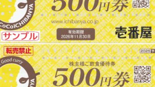 2025/11/17、株主優待の「株主様ご飲食優待券」を頂きました!!100株の保有ですので、1,000円分(500円券×2枚)となります。カレー🍛の値段もだいぶ高くなったみたいですが、長らく保有しようと思います。株式会社壱番屋さんありがと...