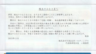 2025/12/2、株主優待のクオカード1,000円分を頂きました!!100株保有で、保有期間にかかわらず1,000円分になります。株式会社アイナボホールディングスさんありがとう!!過去の配当情報はコチラ!!